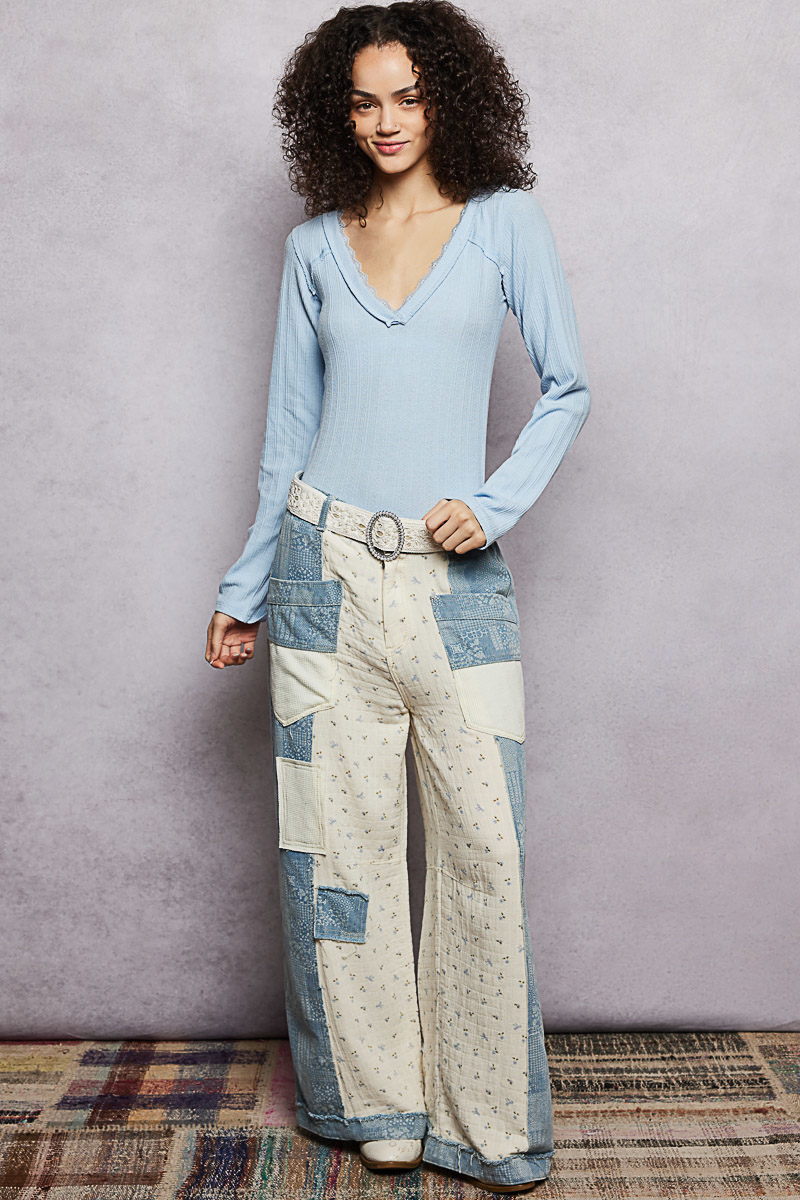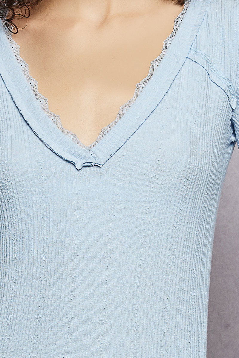 POL V-Neck Long Sleeve Ribbed Top with Lace-Accent Neckband