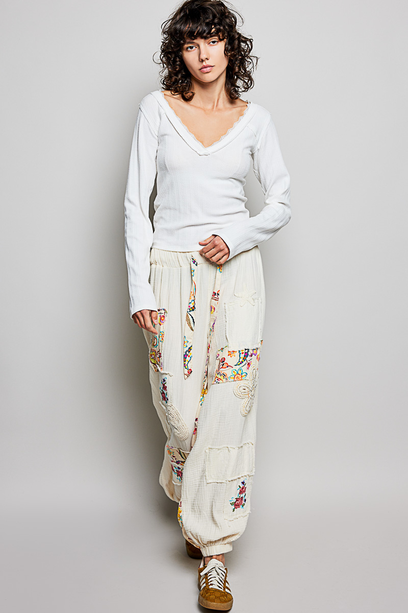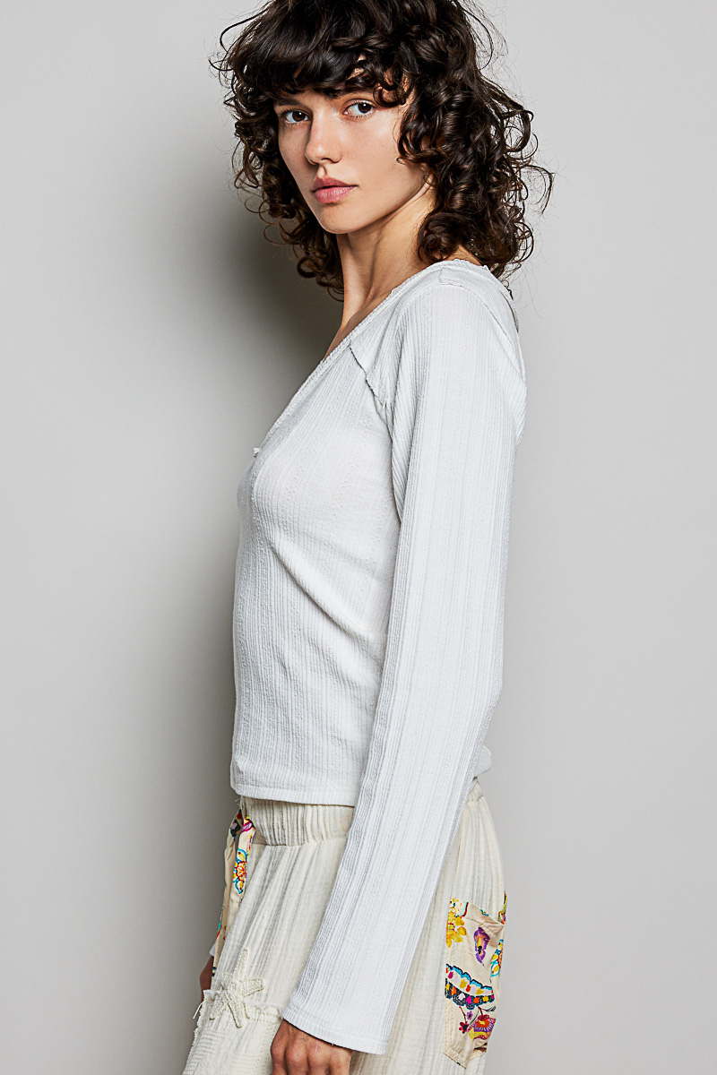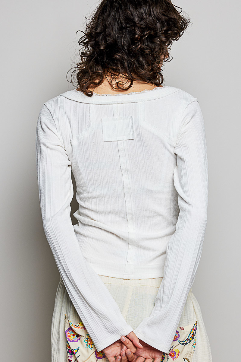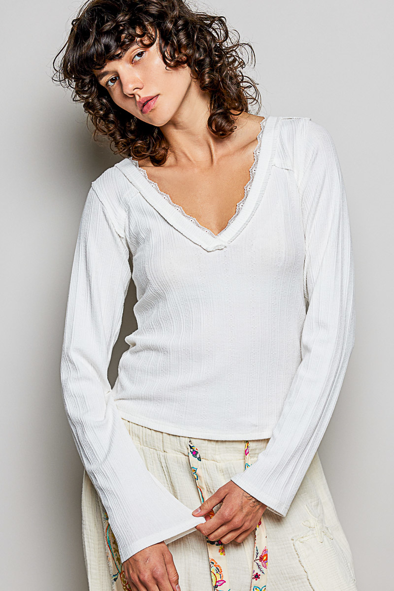 POL V-Neck Long Sleeve Ribbed Top with Lace-Accent Neckband