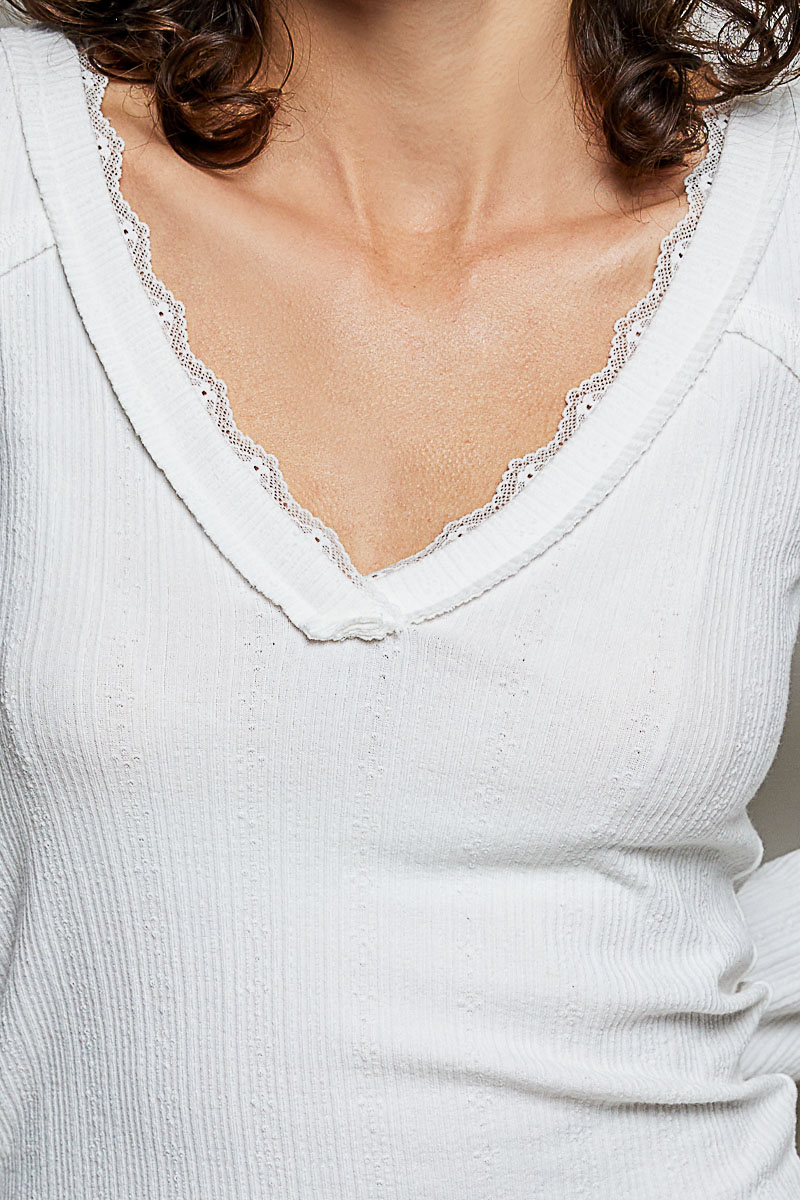 The V-neck long-sleeve slim-fit ribbed top is a sophisticated and versatile wardrobe staple. It showcases a lace-accent neckband and delicate outseam details, adding a touch of elegance to a clean solid-color finish. This top can be effortlessly styled as a chic layering piece or worn on its own for a soft and comfortable everyday look. Perfect for pairing with a skirt or trousers for a polished ensemble, this top transitions seamlessly from day to night. With its flattering slim-fit silhouette and timeless design, it is a must-have essential for any fashion-forward individual.