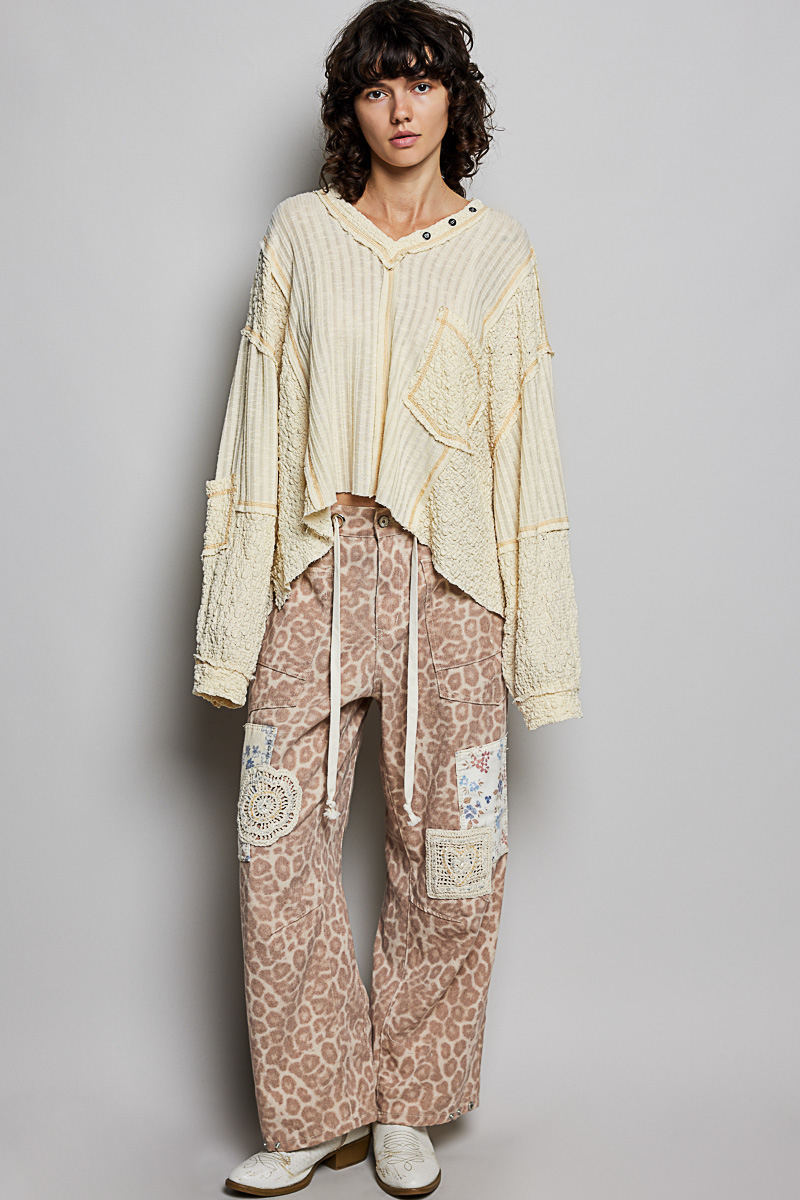 This top is designed with a V-neck, balloon sleeves, and a roomy fit for a chic and relaxed style. The ribbed fabric features stitch detailing and a pointed solid pattern for added texture and interest. The non-functional button detail lends a touch of sophistication and charm to the top. Perfect for achieving a trendy and effortless look with its combination of stylish elements. A versatile piece that can be dressed up or down for various occasions.