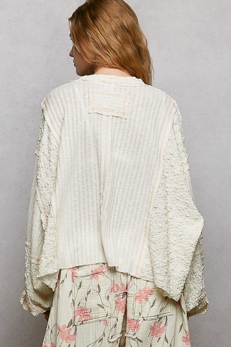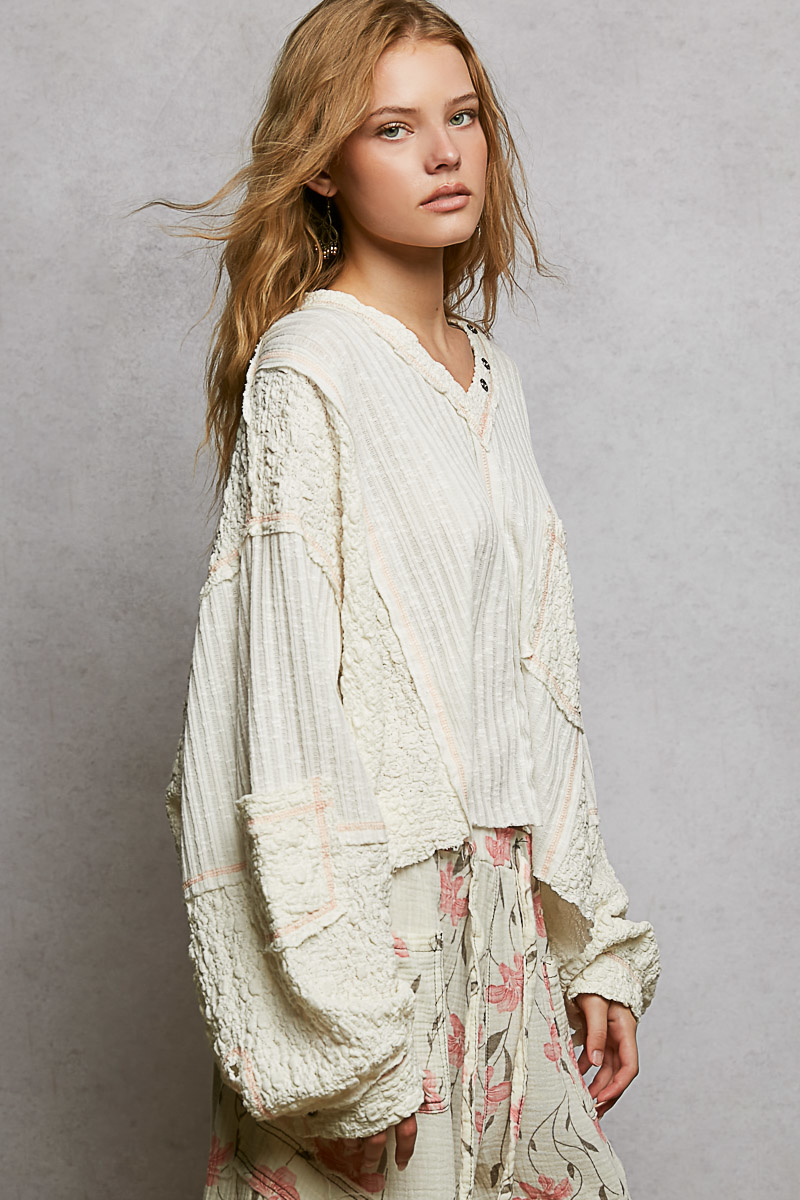 This top is designed with a V-neck, balloon sleeves, and a roomy fit for a chic and relaxed style. The ribbed fabric features stitch detailing and a pointed solid pattern for added texture and interest. The non-functional button detail lends a touch of sophistication and charm to the top. Perfect for achieving a trendy and effortless look with its combination of stylish elements. A versatile piece that can be dressed up or down for various occasions.