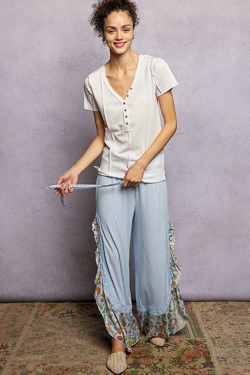This top features a designed V-neck placket and short sleeves for a stylish look. It has a regular fit and is made from textured knit fabric. The stitch seam detail adds visual interest to the piece. The pointed solid pattern provides a unique and modern touch. Overall, this top offers a blend of fashionable design and comfortable wear.