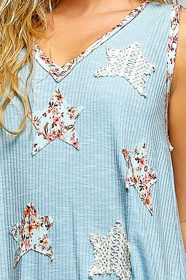 POL Washed Ribbed V-Neck Tank with Floral Print Star Patch