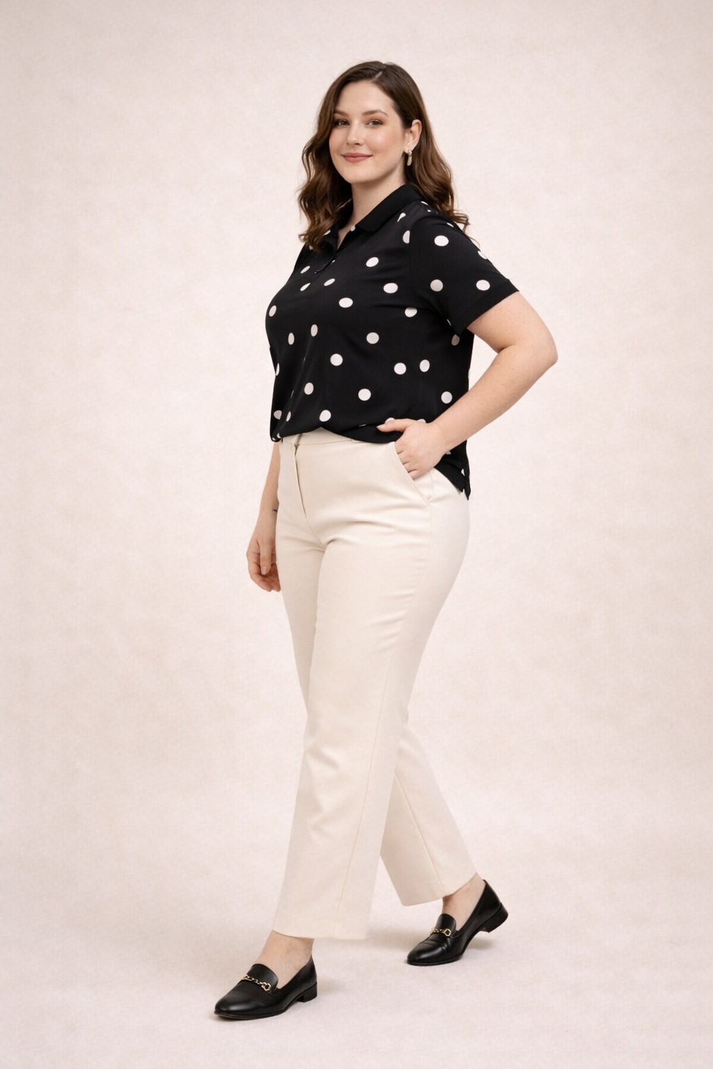 The Polka Dot Polo Top is a timeless essential with a playful, modern twist. Featuring a classic black base with an allover white polka dot print, it delivers an effortlessly polished look that works for a variety of occasions. The collared neckline and short sleeves give it a structured, polo-inspired silhouette that feels both refined and relaxed. Crafted from lightweight, comfortable fabric, it’s designed for easy all-day wear. Its versatile style makes it perfect for office casual settings, weekend outings, or everyday styling. Simple yet eye-catching, this top adds a fresh update to a wardrobe staple.