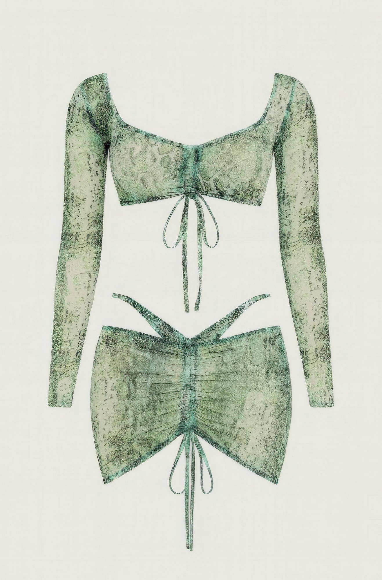 This printed sheer two-piece set is made to make a statement, blending bold design with a light, airy feel. The crop top features long sleeves and a center adjustable drawstring, allowing you to customize the fit and gather for a flattering look. Paired with a matching mini skirt, the set showcases an allover print on sheer fabric for a sultry yet sophisticated vibe. Crafted from a polyester-spandex blend, it offers subtle stretch while maintaining its delicate drape. Perfect for parties, vacations, or any moment that calls for standout style.