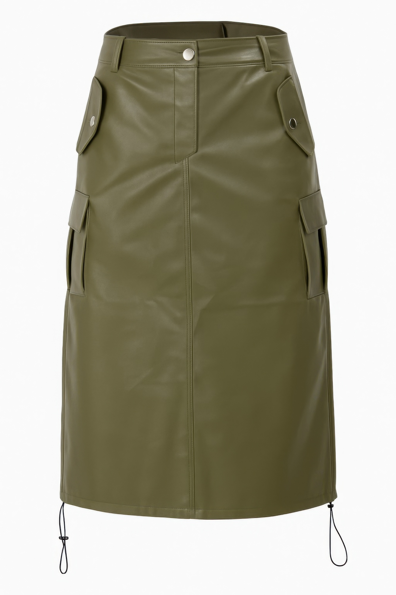 Bold and refined, this PU Side Pockets Midi Skirt brings sleek structure to any look. Crafted from high-shine PU fabric, it features a classic midi length with a button-front design for a touch of edge. Functional side pockets add a utilitarian element, while the adjustable bottom hem lets you customize the silhouette to suit your style. The polyester-spandex blend provides a flexible fit with subtle structure, making it as comfortable as it is statement-making. Perfect for pairing with fitted tops, boots, or blazers for an elevated finish.