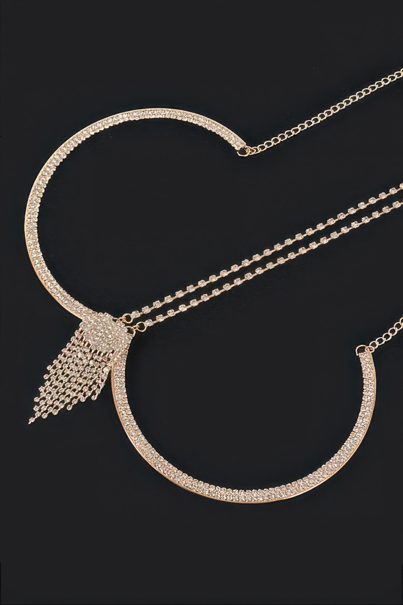 Illuminate your outfit with this rhinestone bra chain, crafted to deliver bold glamour with refined detail. Designed with sparkling stones set along delicate chains, it contours beautifully for a flattering, jewelry-inspired accent. The shimmering finish catches the light from every angle. Perfect for layering over sleek silhouettes, it adds texture and shine without overpowering your look. Whether styled for special occasions or statement streetwear, it offers undeniable impact.