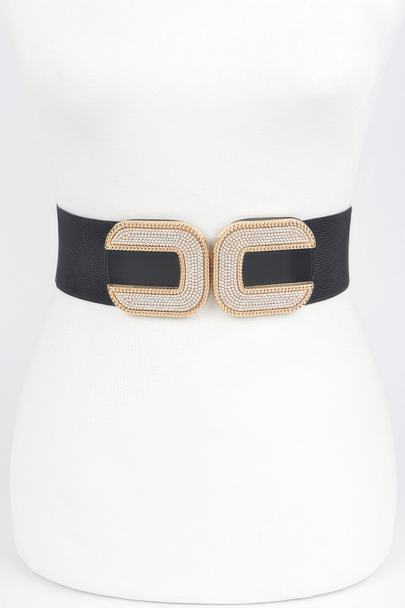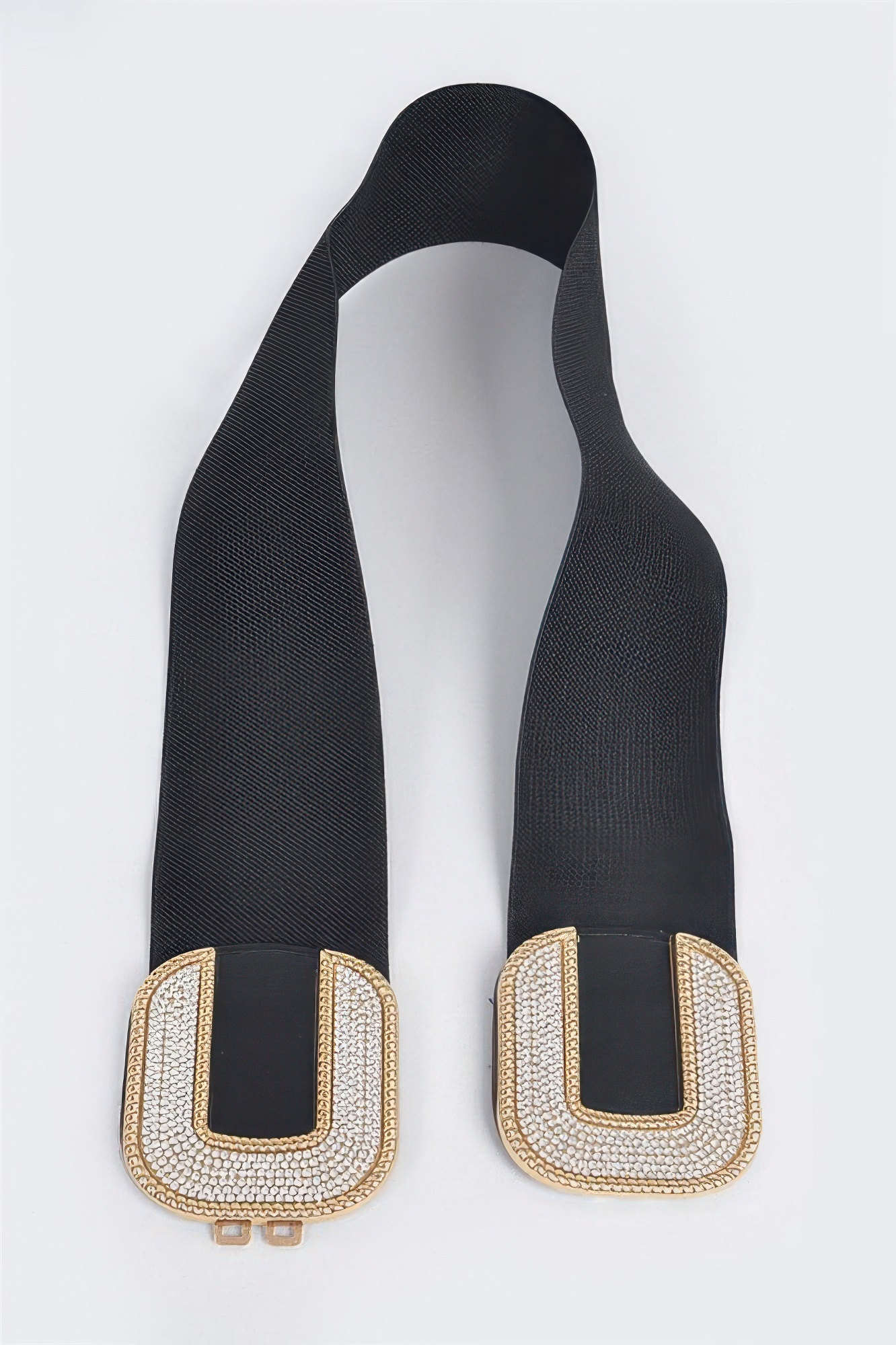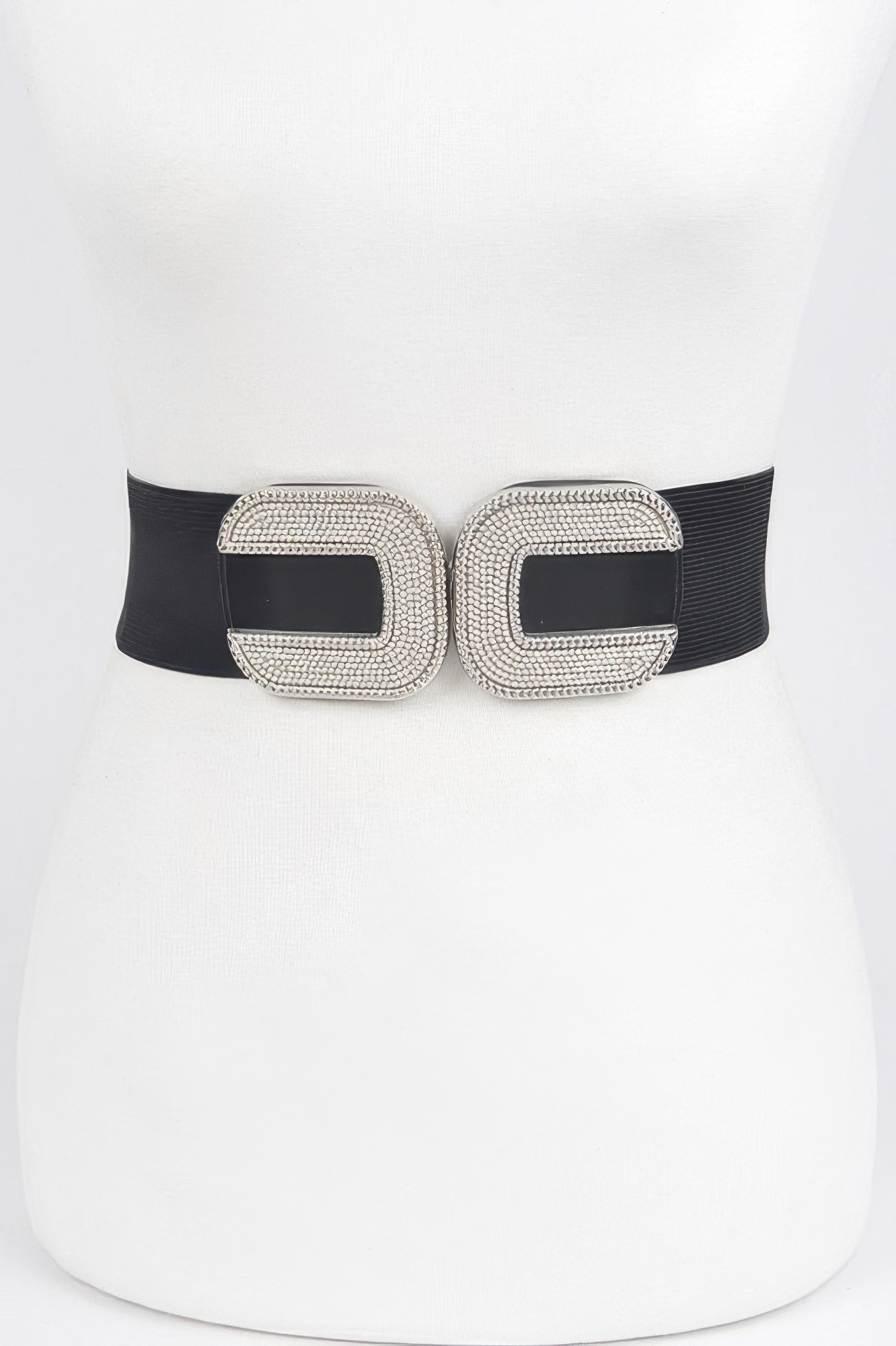 This rhinestone buckle stretch belt features a sleek design highlighted by a sparkling buckle that adds a refined statement to any outfit. The stretch construction ensures a flexible and comfortable fit, while the structured width enhances your silhouette. Its smooth finish complements both casual and dressy styles. Easy to wear and style, it provides both function and elegance. A standout accessory, it adds a polished touch with subtle shine.