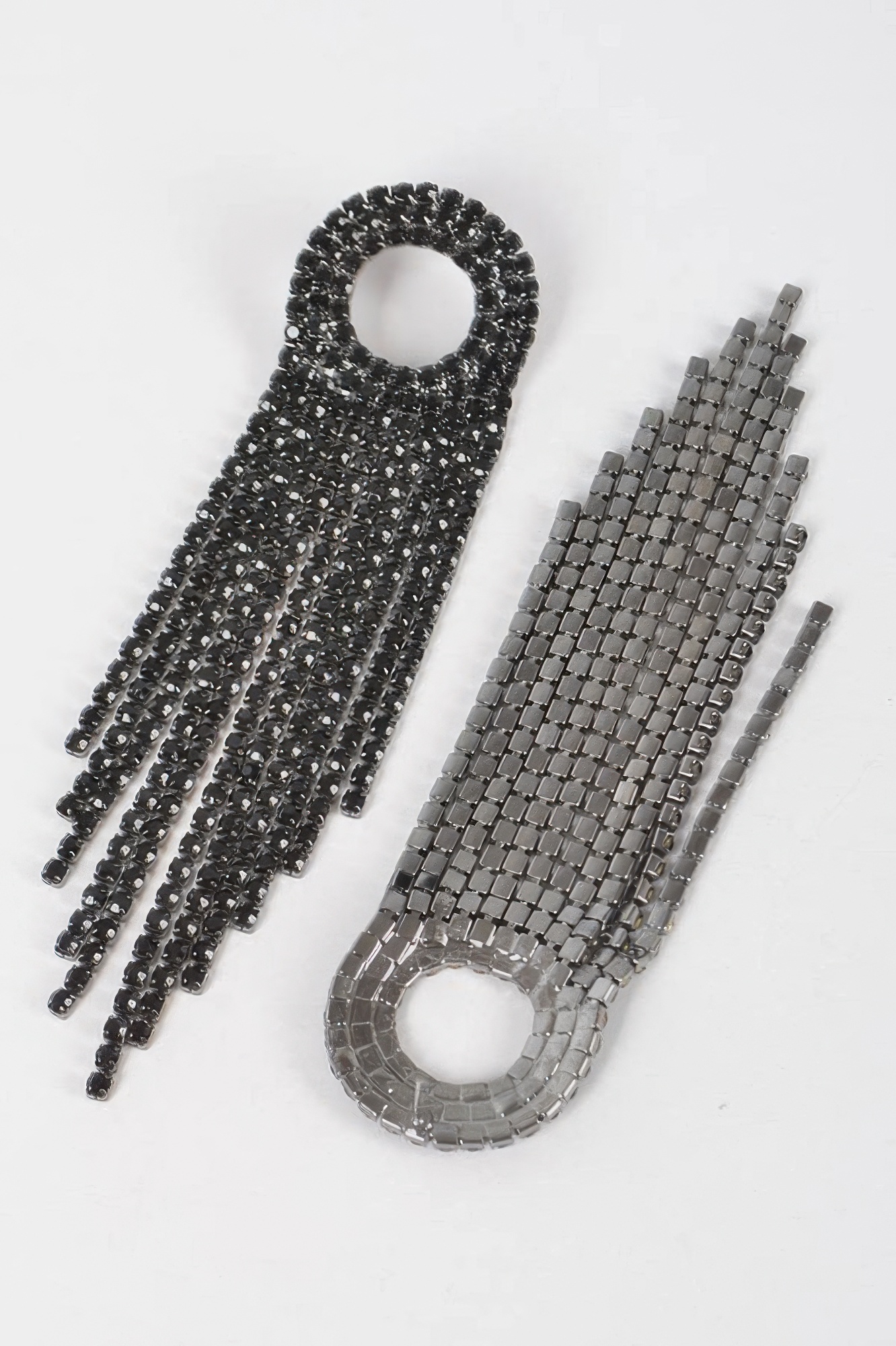 The Rhinestone Fringe Earring offers dramatic length and radiant sparkle. Designed with cascading rhinestone strands, it creates fluid movement and eye-catching shine. The elongated silhouette enhances evening and formal looks with elegant dimension. Despite its statement size, it remains lightweight for comfortable wear. A glamorous accessory made for standout occasions.