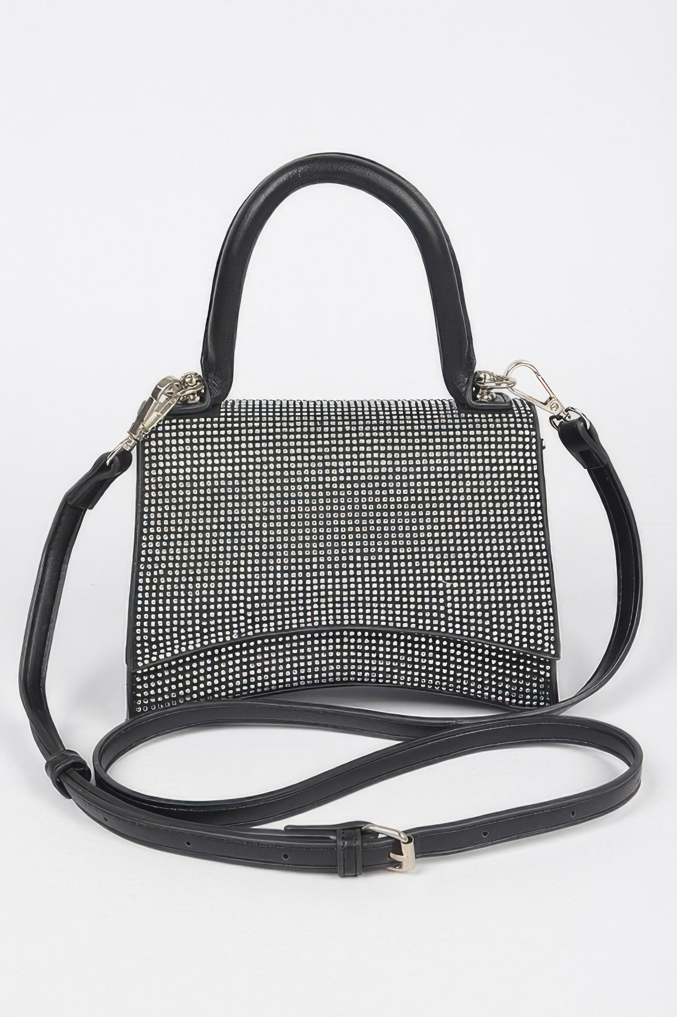 The Rhinestone Top Handle Bag combines structured elegance with eye-catching sparkle. Covered in shimmering rhinestone detailing, it creates a glamorous statement perfect for evening occasions. The structured top handle silhouette adds timeless sophistication while keeping your essentials secure. Crafted with mixed metal accents, it offers durability and refined finishing touches. An ideal accessory for formal events, parties, and special celebrations.