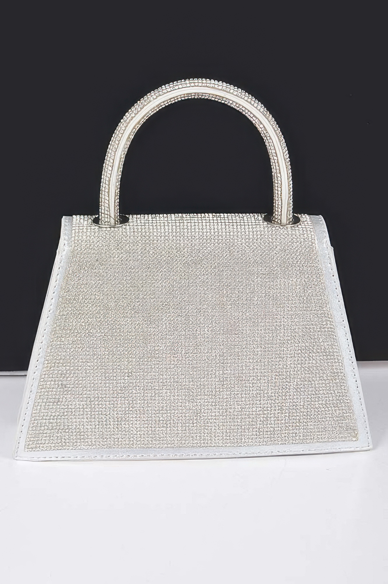 Make a striking entrance with the Rhinestone Top Handle Clutch, a structured silhouette covered in radiant rhinestones. Compact yet roomy enough for essentials, it features a sleek top handle and a softly structured body. Crafted from polyurethane with metallic accents, this clutch brings modern elegance to your eveningwear. It’s the perfect finishing piece for special occasions or nights out.