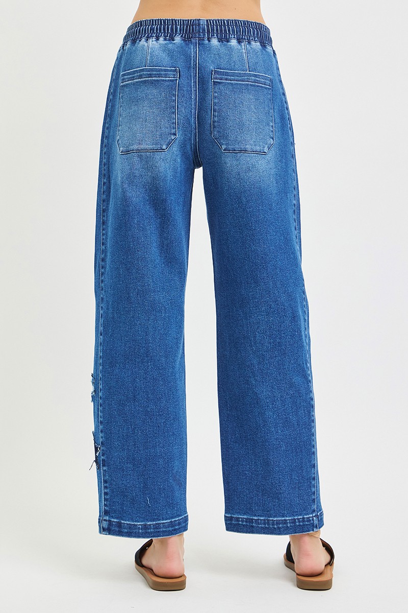 These elastic band slouchy cropped barrel jeans feature a comfortable elastic waist, a relaxed slouchy cropped barrel fit, and eye-catching star patch details, combining casual comfort with trendy design for a stylish and easy-to-wear everyday look.