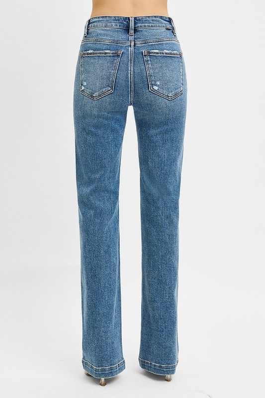 These classic blue boot-leg jeans create a flattering silhouette while offering a sleek vintage-inspired look. Made from high-quality stretch denim fabric for all-day comfort and a perfect fit on the hips and thighs. The mid-blue wash with a subtle fade gives them a versatile appeal and is suitable for both casual and semi-formal occasions. The traditional five-pocket construction and belt-loop waistband ensure classic jeans functionality, while the bootcut design makes them perfect for teaming with heels, boots or sandals. These jeans embody timeless denim craftsmanship and modern comfort technology.