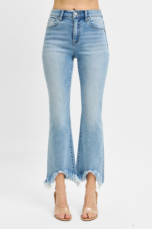 Step up your denim game with these High Rise Crop Bootcut Fray Hem Jeans. The high-rise waist adds a flattering touch, while the cropped length and bootcut style create a trendy silhouette. The frayed hem detail adds an edgy and stylish flair to your outfit. Perfect for casual or dressed-up occasions, these jeans will keep you looking on point.