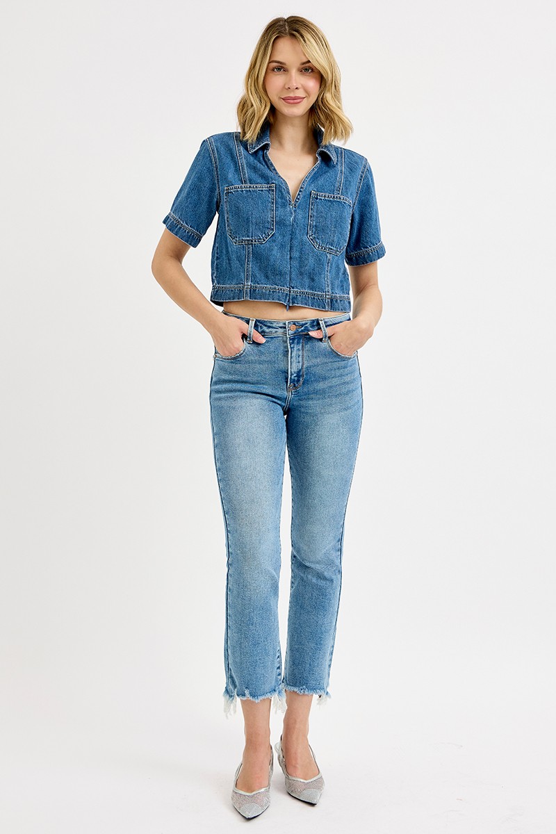 These fashion cropped straight jeans feature a flattering mid-rise waist and comfortable stretch denim fabric. The light vintage wash creates a lived-in look with authentic fading and subtle whiskering details. The raw, frayed hem adds a modern edge to the classic straight leg silhouette. Made from premium cotton-blend denim with added stretch for all-day comfort and shape retention. The versatile ankle length pairs perfectly with heels, sneakers, or boots, making these jeans ideal for both casual daytime looks and elevated evening outfits.