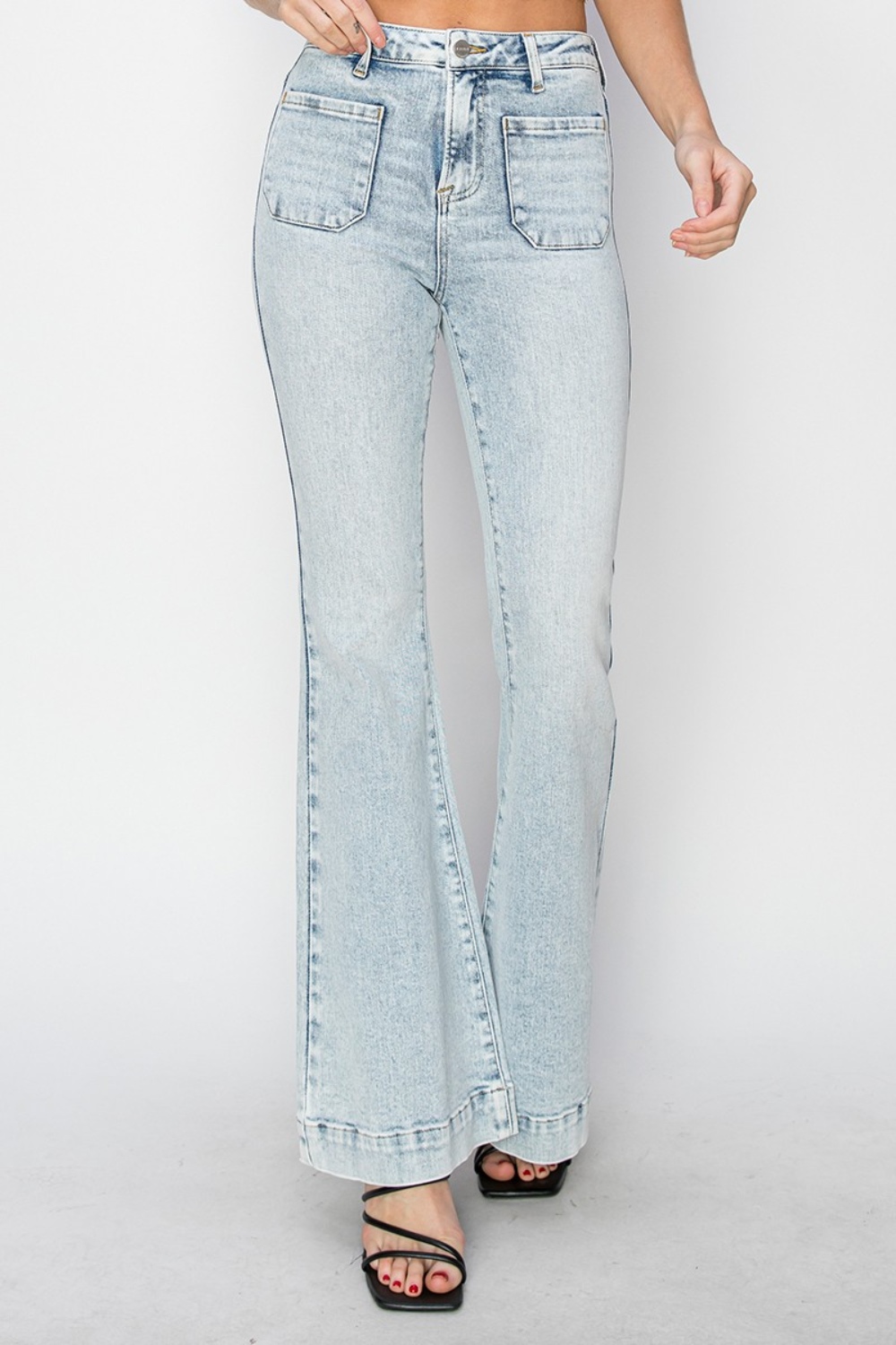 These High Rise Front Patch Pocket Flare Jeans feature a trendy and stylish design. The front patch pockets add a unique touch to the flattering high-rise silhouette. With a flare leg, these jeans offer a contemporary and flattering fit. Perfect for a casual yet fashionable look, these jeans can be dressed up or down. Made from comfortable denim fabric, they are great for all-day wear. Elevate your wardrobe with these versatile and on-trend jeans.