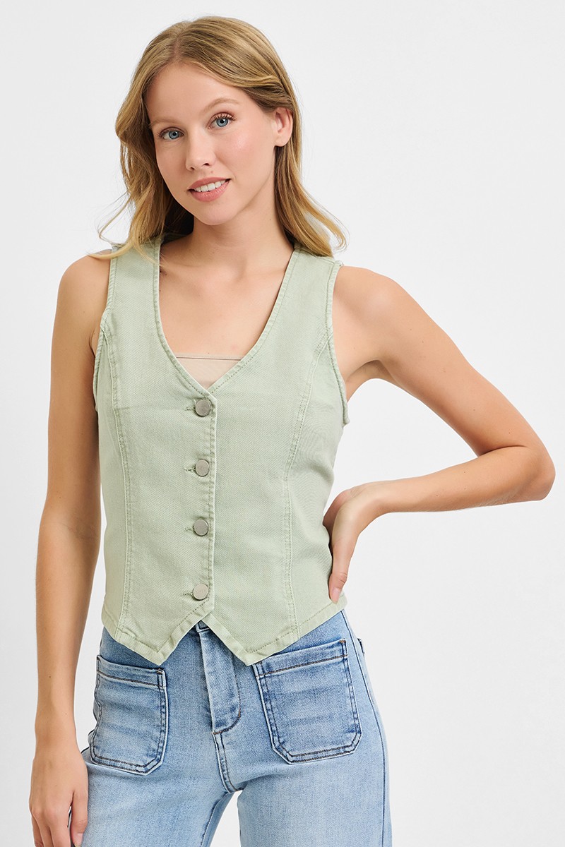 The v-neck button-down vest is a chic and versatile layering piece for your wardrobe. With a flattering v-neckline and classic button-down closure, this vest offers a polished and sophisticated look. Perfect for adding a stylish touch to any outfit, whether paired with a blouse and trousers for a professional ensemble or with a tee and jeans for a more casual vibe. Stay stylish and comfortable with the v-neck button-down vest for a sleek and on-trend outfit.