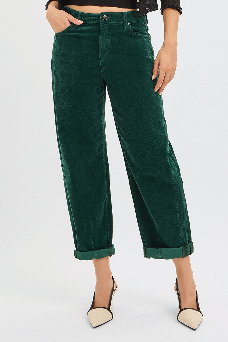 The high-rise crop barrel corduroy pants offer a stylish and retro-inspired addition to your wardrobe. The barrel cut provides a unique and flattering silhouette that is both modern and timeless. Made from corduroy fabric, these pants offer a soft and textured feel, perfect for colder seasons. The high-rise waist elongates the legs and creates a streamlined look. Pair these pants with boots and a sweater for a cozy and chic outfit that channels vintage vibes with a contemporary twist.