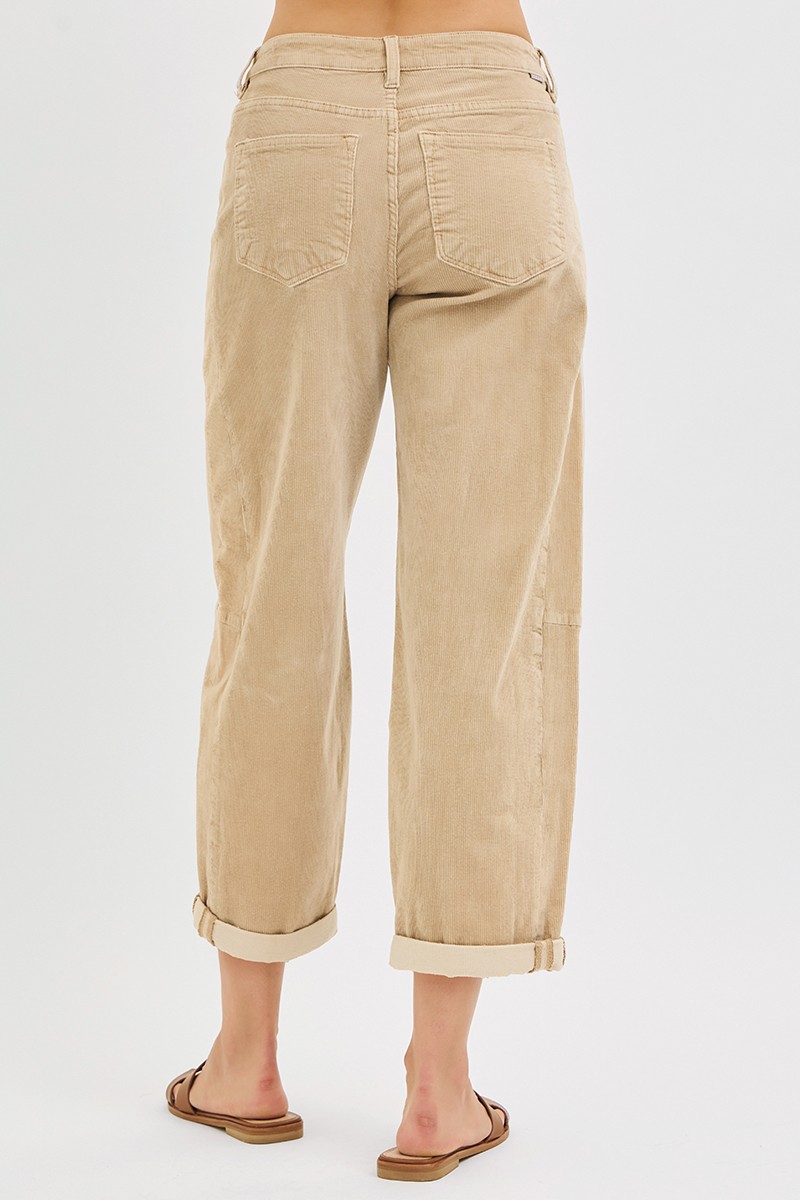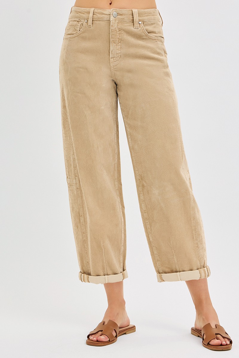 The high-rise crop barrel corduroy pants offer a stylish and retro-inspired addition to your wardrobe. The barrel cut provides a unique and flattering silhouette that is both modern and timeless. Made from corduroy fabric, these pants offer a soft and textured feel, perfect for colder seasons. The high-rise waist elongates the legs and creates a streamlined look. Pair these pants with boots and a sweater for a cozy and chic outfit that channels vintage vibes with a contemporary twist.
