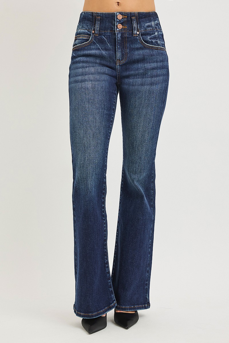 These high rise flare jeans feature a unique seam detail waistband that enhances the flattering high-waisted fit, with a timeless flare leg design that elongates the silhouette and adds a stylish retro touch, combining comfort and fashion to become a versatile staple for everyday and dressy casual outfits.