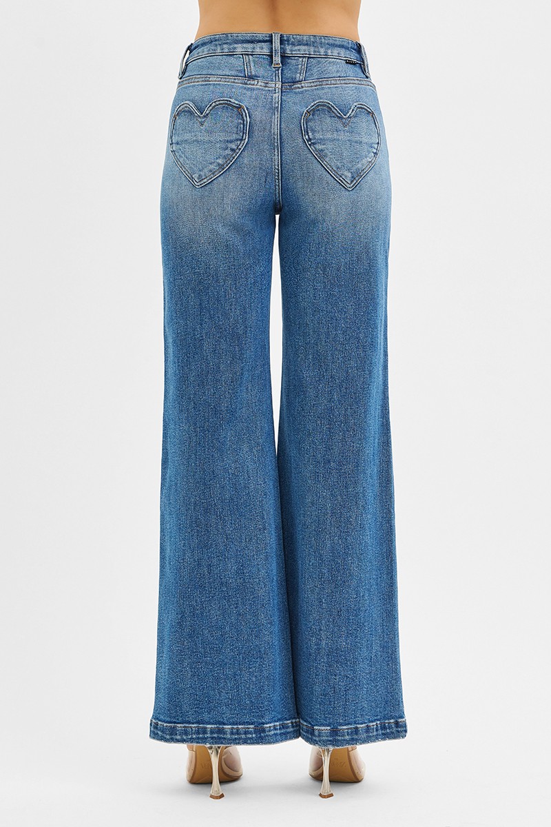 These High Rise Wide Leg Jeans with Front Yoke and Heart Back Pocket offer a trendy and unique style. The high-rise waist provides a flattering and elongating effect. The wide leg design adds a fashion-forward touch to the jeans. Featuring a front yoke for added detail and heart-shaped back pockets for a charming finish. Elevate your denim collection with these stylish and fun high rise wide leg jeans.