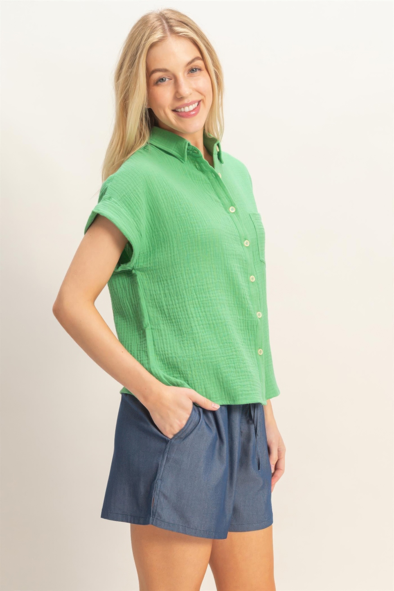 Refresh your warm-weather essentials with this rolled sleeve button-up top, designed for effortless versatility. Crafted from 100% cotton, it offers a lightweight, breathable feel that keeps you comfortable throughout the day. The classic button-front design delivers timeless appeal, while rolled sleeves add a relaxed, casual touch. A single chest pocket enhances the look with subtle utility-inspired detail. Its easy silhouette makes it ideal for layering or wearing on its own. Pair it with denim shorts for a clean, laid-back summer ensemble.