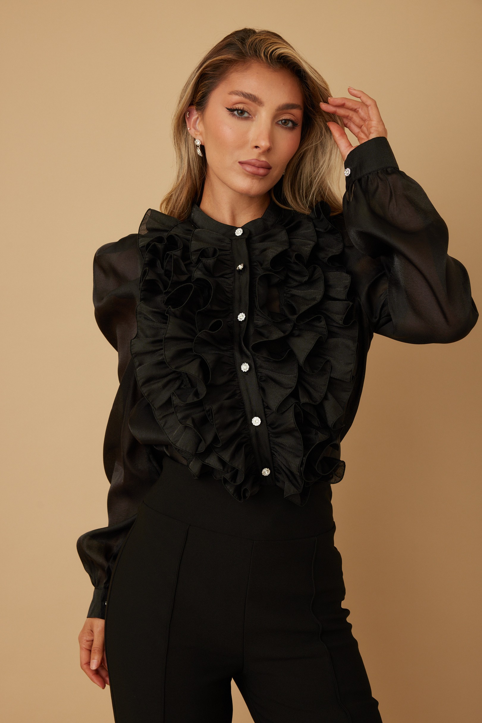 Delicate and detailed, the Ruffle Micro Crystal Long Sleeve Blouse brings a touch of romance to any wardrobe. Designed with sheer fabric and graceful ruffle accents, this blouse features micro crystal buttons that add a subtle shimmer down the front. A round neckline and puff shoulder caps lend classic structure, while the long sleeves balance the soft, flowing silhouette. Ideal for both day and evening styling, this blouse pairs effortlessly with trousers, skirts, or high-rise denim for a polished look with feminine charm.