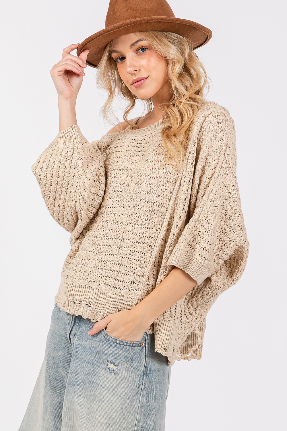 This distressed asymmetrical open stitch sweater is a stylish pullover designed for comfort and versatility. Featuring half sleeves and a round neckline, it offers a relaxed and loose fit that makes it perfect for layering or wearing on its own. The unique asymmetrical design and distressed details add a trendy touch, making it an ideal choice for casual outings or cozy days at home.