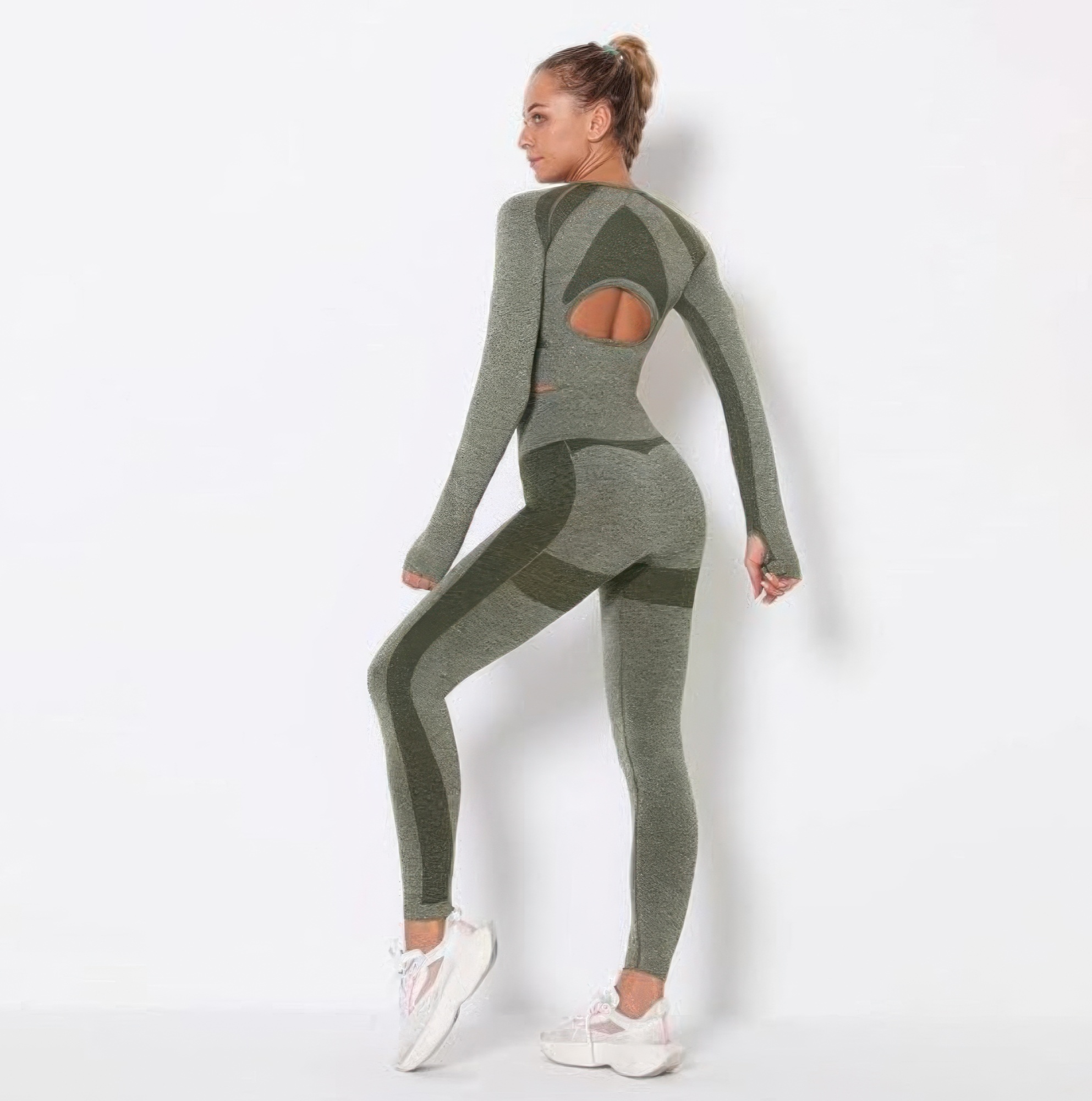 Train, stretch, and move with ease in this seamless long sleeve yoga set, thoughtfully designed for comfort and performance. Featuring a bold color block design, the two-piece set includes a long sleeve crop top with cut-out accents that offer breathable flair. The high-waisted leggings sculpt and support, creating a streamlined fit that flatters every angle. Crafted from a flexible, stretch-infused nylon-spandex blend, this set hugs the body while allowing full freedom of movement. Whether you're hitting the mat or embracing off-duty style, this set delivers on both function and form.