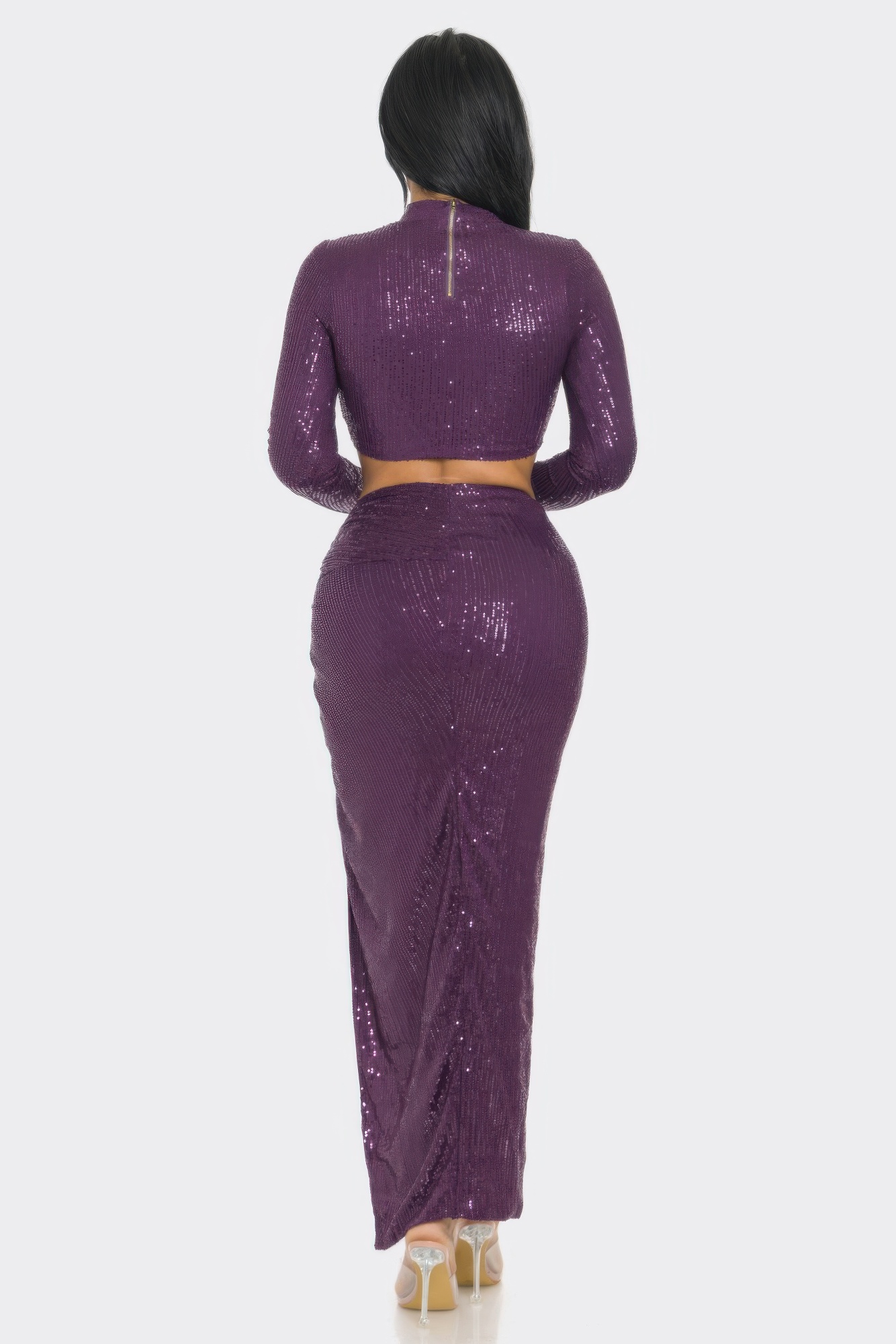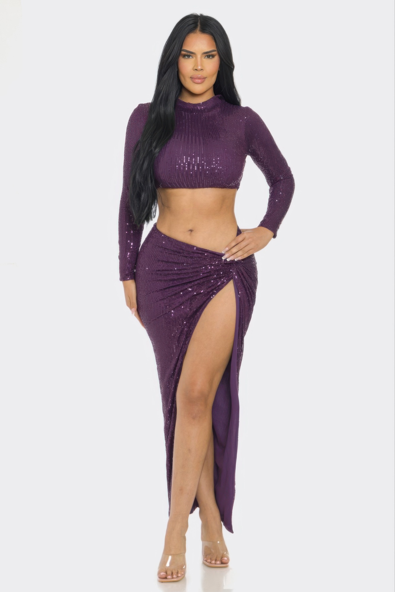 Two-piece set featuring a sequin long sleeve top and matching skirt