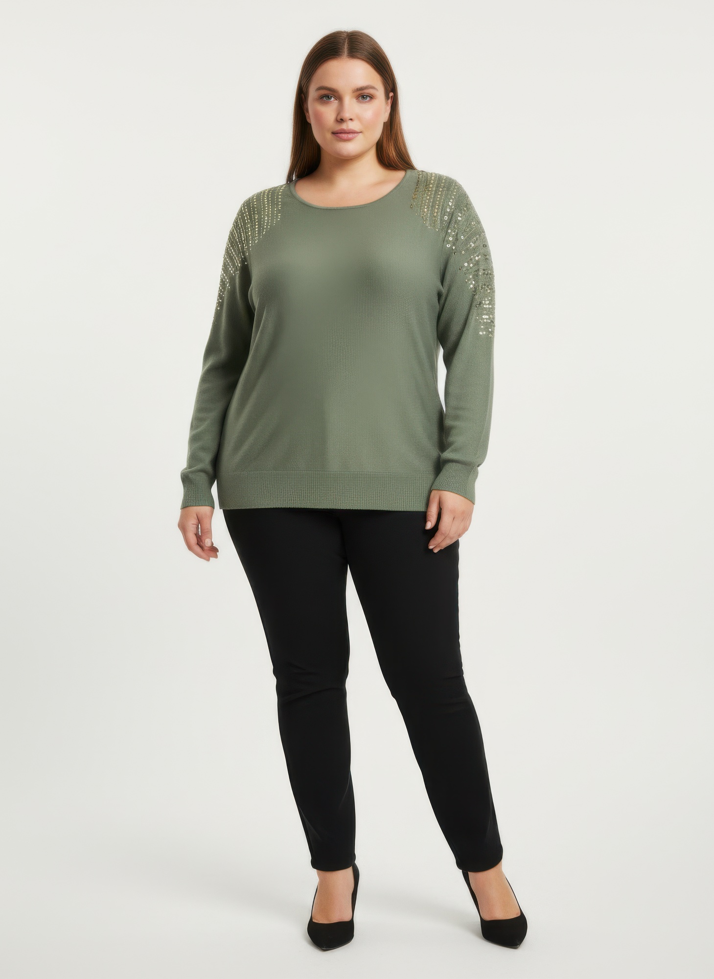 Sequin embellishments along the shoulders for subtle sparkle