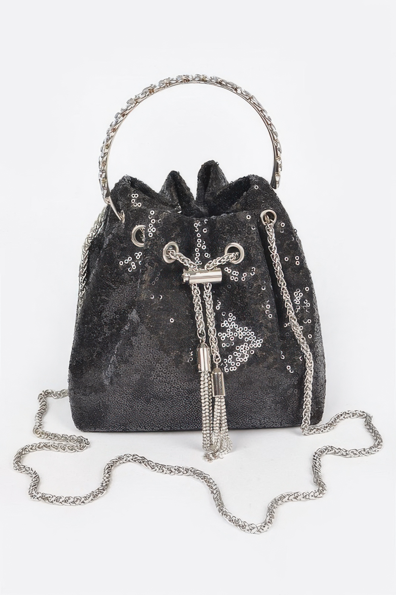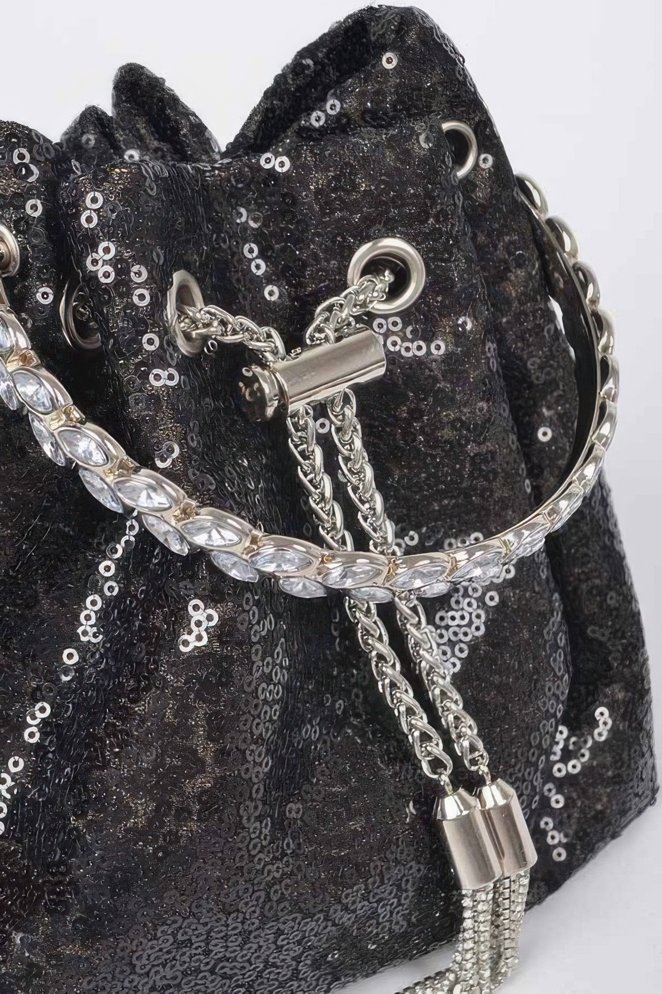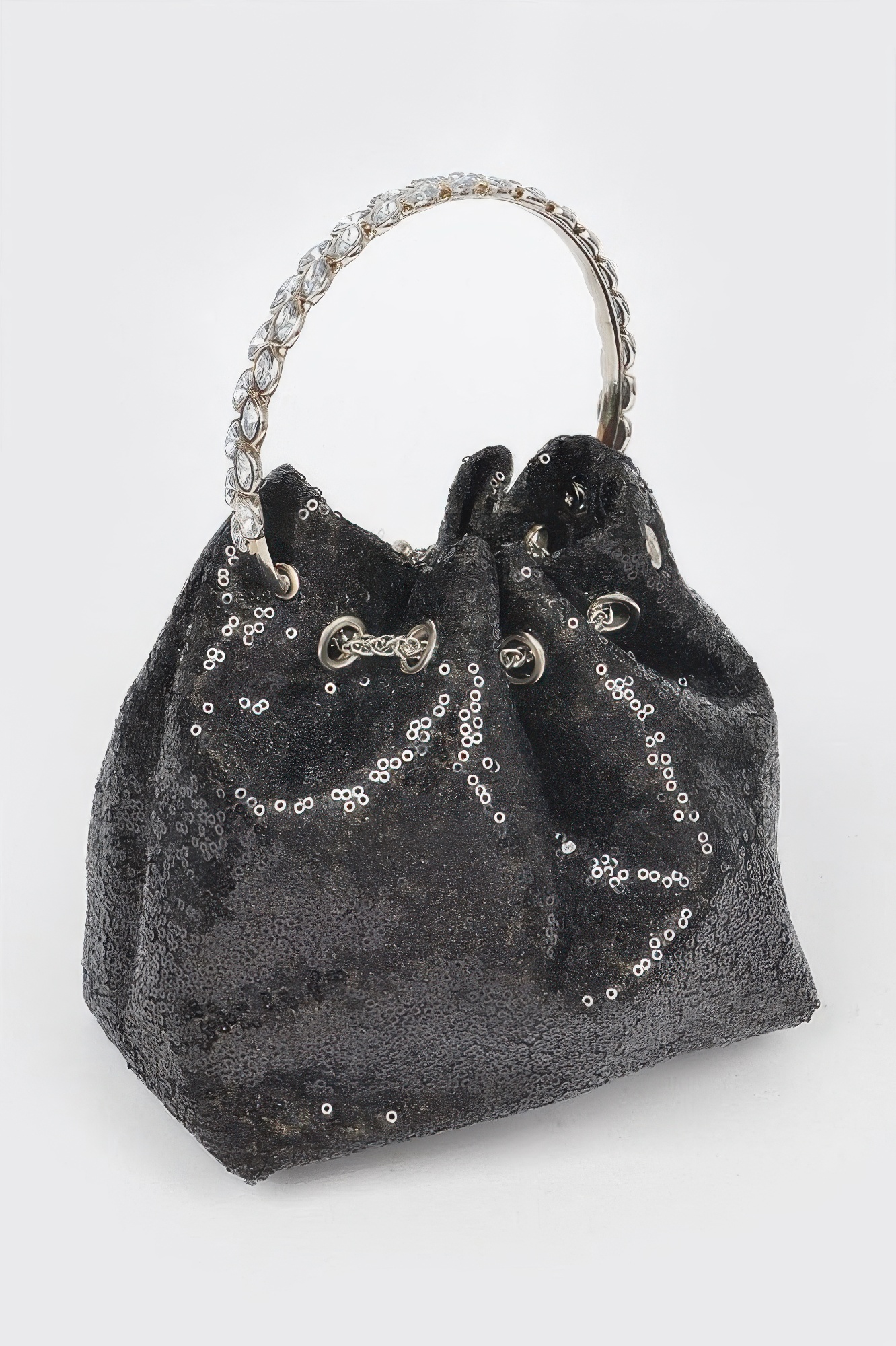 The Sequins Bucket Bag with Stone Handle blends playful shimmer with refined structure. Designed in a classic bucket silhouette, it features allover sequin detailing that adds texture and radiant shine. The stone-accented handle creates a striking focal point, elevating the overall design. Its compact yet functional size makes it ideal for carrying essentials while maintaining a statement look. Perfect for parties, evenings out, or standout styling moments.