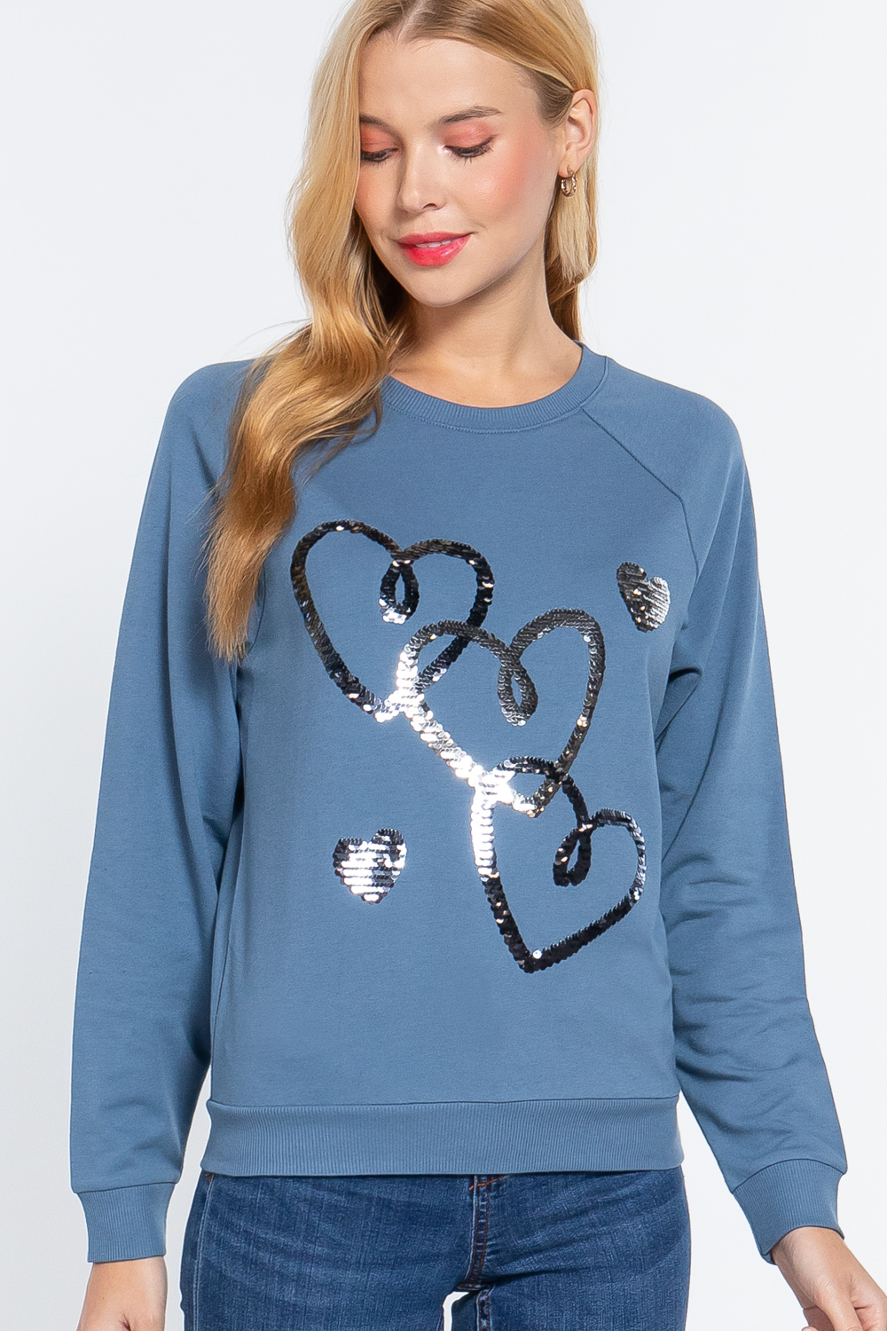 Product Description Imported S.M.L LONG SLEEVE ROUND NECK SEQUINS EMBROIDERED FRENCH TERRY PULLOVER TOP 57% Cotton 38% Polyester 5% Spandex Vintage Blue LB07-06 Item Measurements: SIZE S Measurements: SIZE S Length:20" Waist:36" Bust:38"
