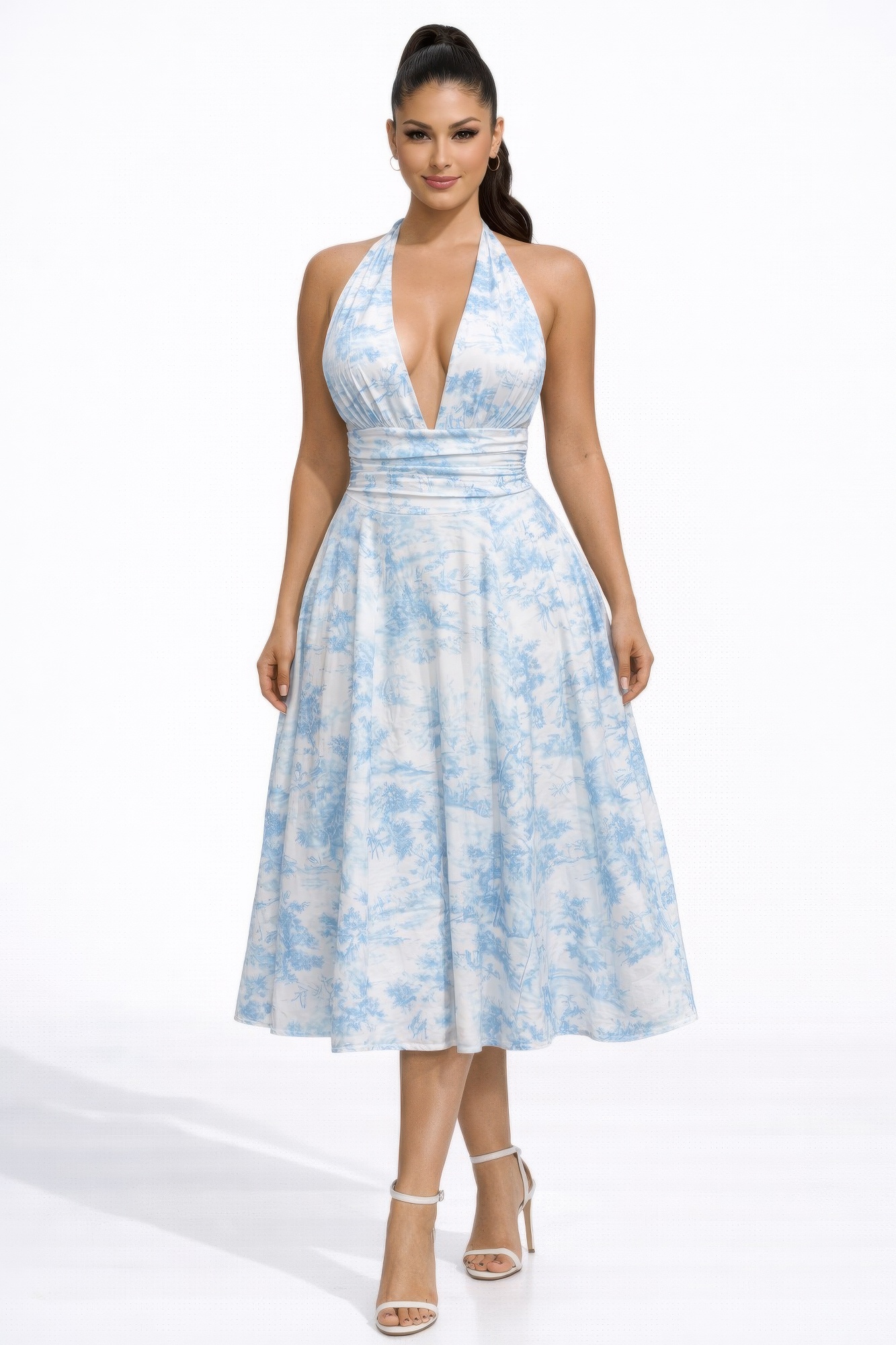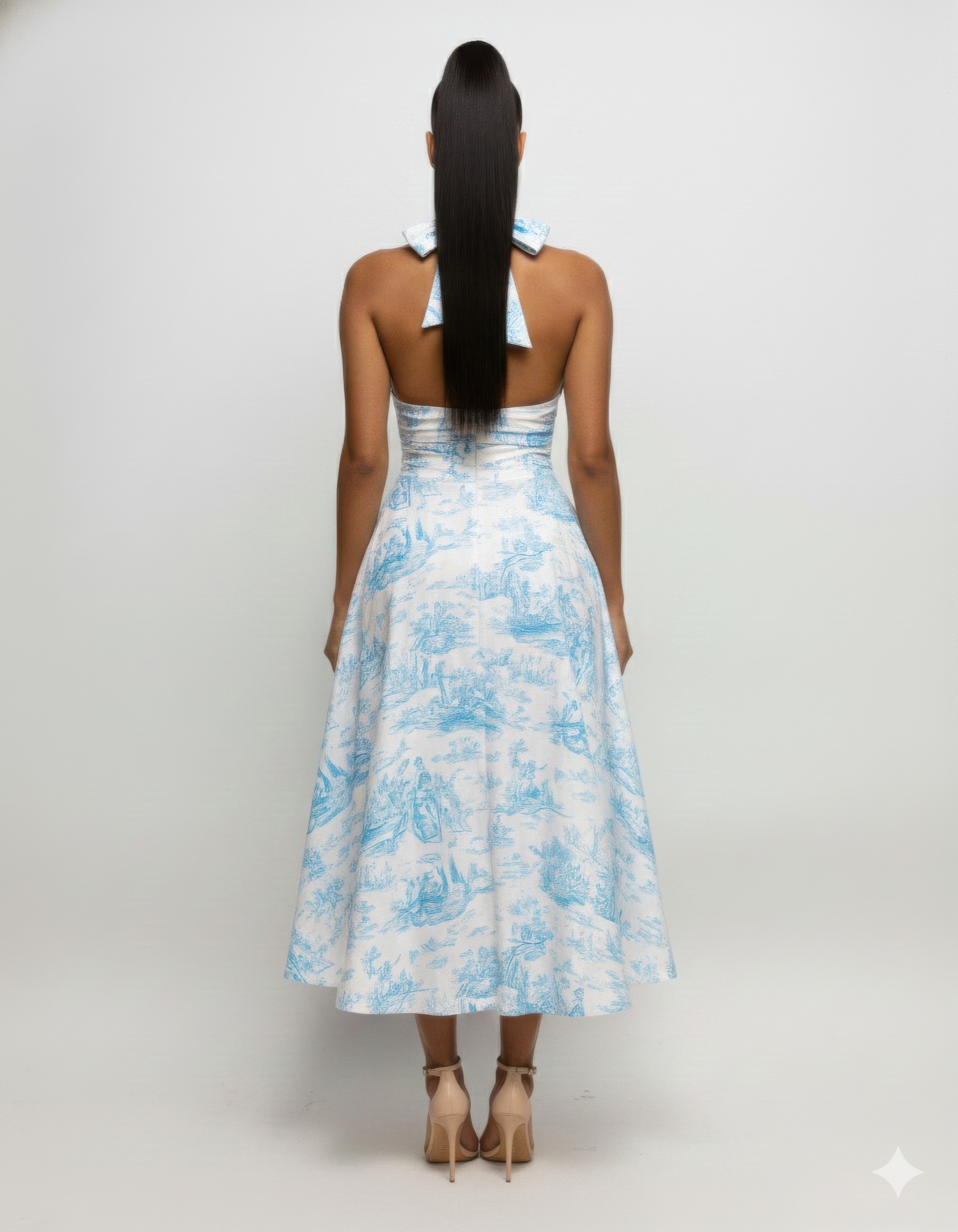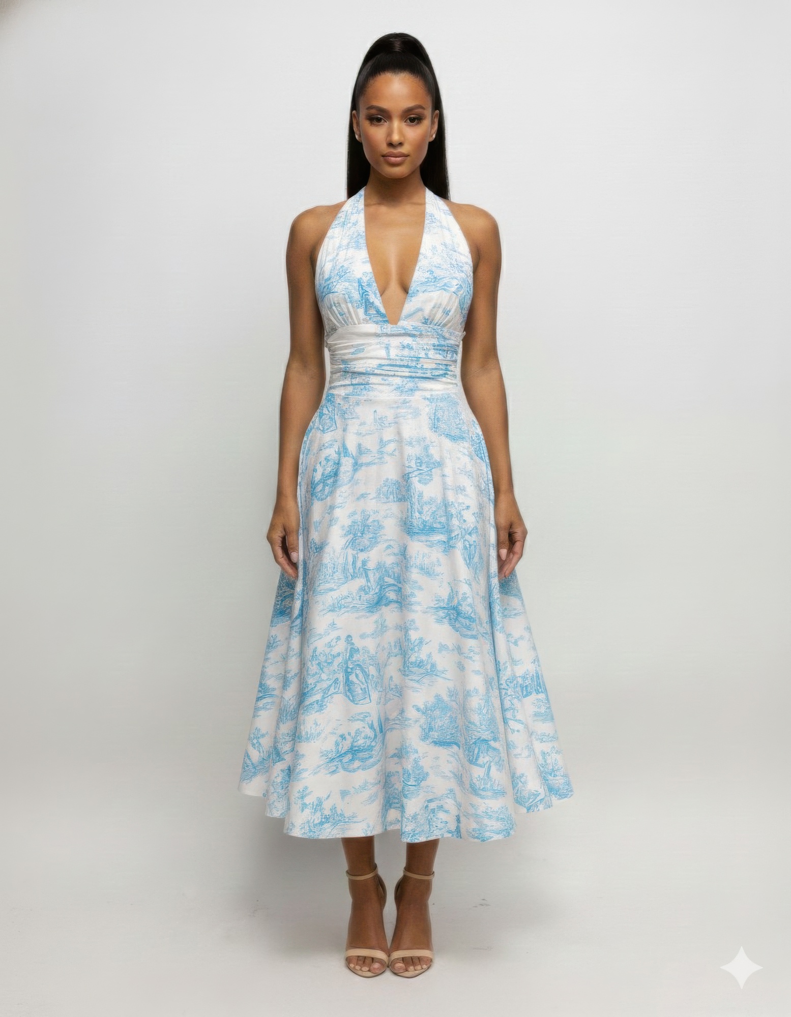 The Seraphina Garden Muse dress is a graceful celebration of timeless femininity, blending romantic detailing with effortless structure. Designed with a halter neckline and a softly plunging front, the bodice beautifully frames the shoulders and décolletage for an elegant, refined silhouette. A fitted waist gently defines the midsection before flowing into a voluminous midi skirt that moves with light, airy fluidity. The delicate all-over print adds a storybook charm, enhancing its artistic and feminine appeal. Hidden side pockets are seamlessly integrated for modern functionality without compromising the clean design. Crafted from smooth, breathable fabric, this dress offers both comfort and polished structure, making it perfect for elevated daytime occasions.