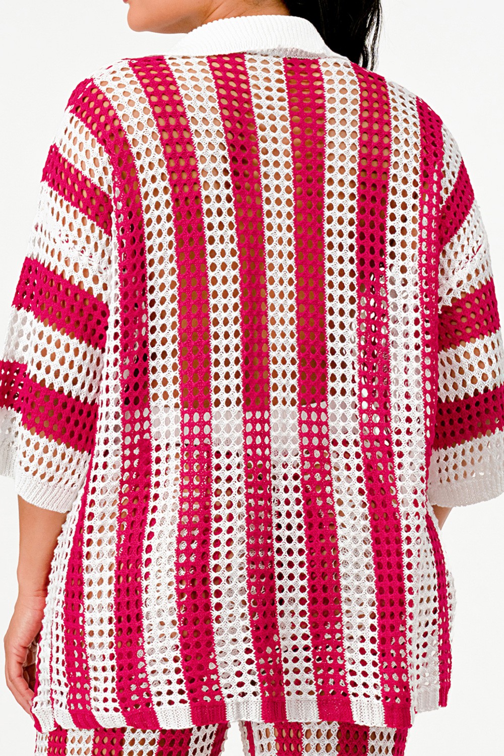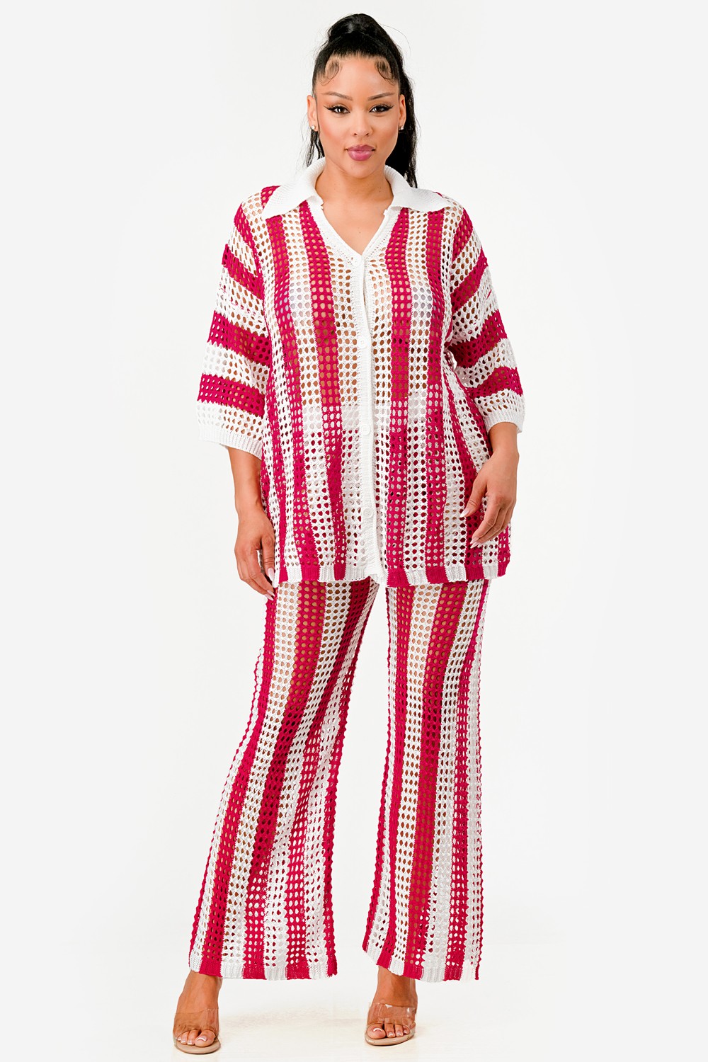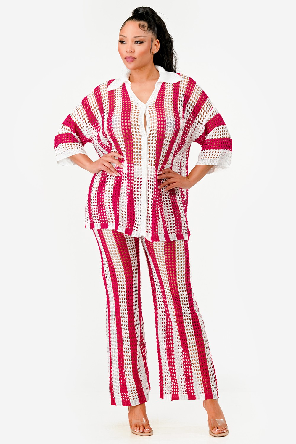 Designed with laid-back elegance in mind, this sheer stripe polo knit pants set is your go-to for warm-weather getaways and breezy days by the coast. Featuring a relaxed-fit polo top with 3/4 length sleeves and lightweight knit pants, this two-piece set delivers comfort without sacrificing style. The sheer striped texture adds a touch of sophistication, while the soft, stretch-infused fabric ensures an effortless fit. Available in three versatile color options, it’s a chic, coordinated look ideal for vacation, beach strolls, or resort lounging.