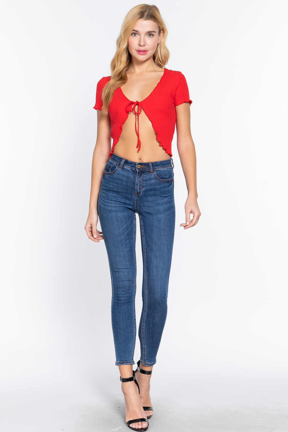 Product Description Imported S,M,L SHORT SLEEVE FRONT TIE DETAIL LETTUCE EDGE VARIEGATED RIB CARDIGAN 92% Cotton 8% Spandex Red LC03-10 Item Measurements: SIZE S Measurements: SIZE SLength:16" Bust:30" Waist:30"