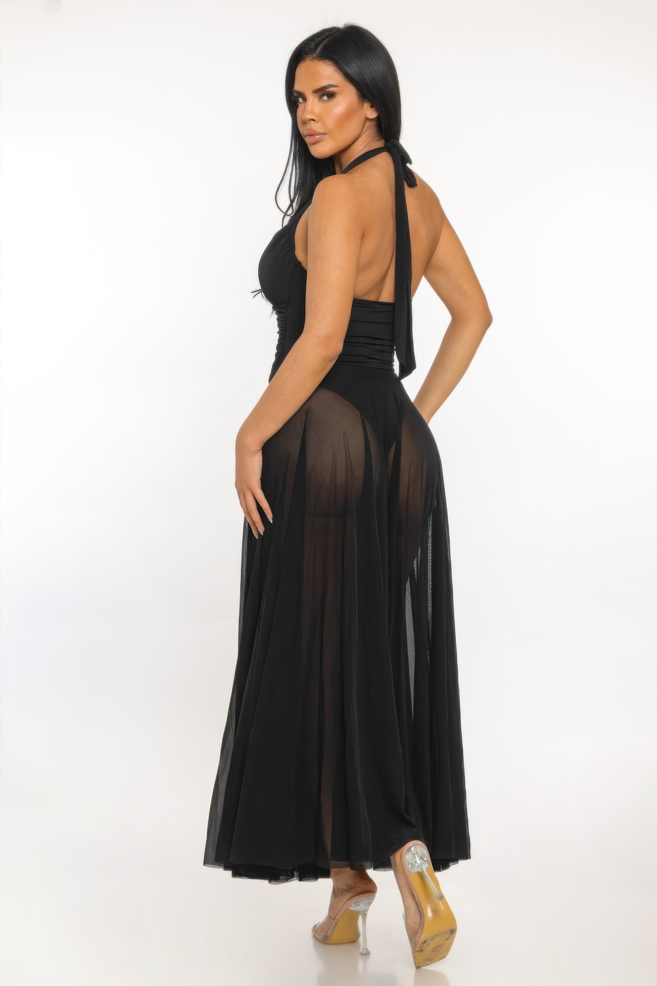 The Siren’s Veil Halter Dress is a striking expression of dark elegance and fluid femininity, designed to captivate with every step. The plunging halter neckline creates a bold yet refined frame for the upper body, while the wrapped, defined waistline enhances and sculpts the silhouette. Transitioning seamlessly from structure to softness, the design flows into a sheer chiffon maxi skirt that drapes with effortless movement. The delicate transparency adds an alluring sense of mystery while maintaining an air of sophistication. Light and ethereal, the skirt reveals subtle layers beneath, creating depth and visual intrigue. Perfect for beachfront evenings or elevated night occasions, this dress is made for unforgettable entrances.