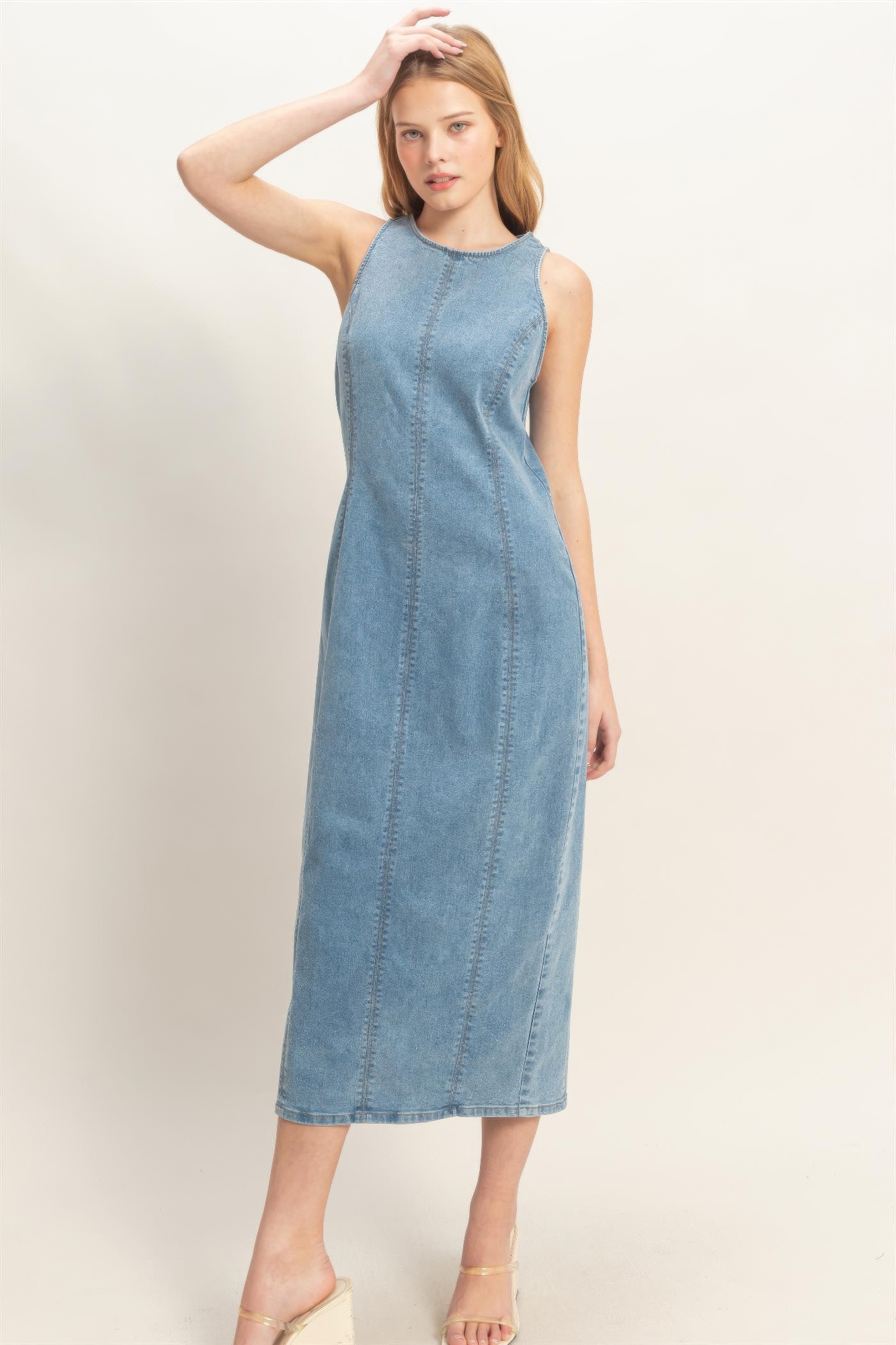 Elevate your everyday lineup with this sleeveless denim midi dress, designed with clean lines and modern versatility. Crafted from a comfortable stretch-blend fabric, it offers structure with a flexible, easy fit. The enzyme wash enhances its soft feel while adding subtle depth and character. A classic crew neckline keeps the silhouette refined, complemented by a straight cut that falls to a flattering midi length. The sleeveless design makes it ideal for layering or warm-weather styling. Pair it with ankle boots and a leather belt for a polished, contemporary ensemble.