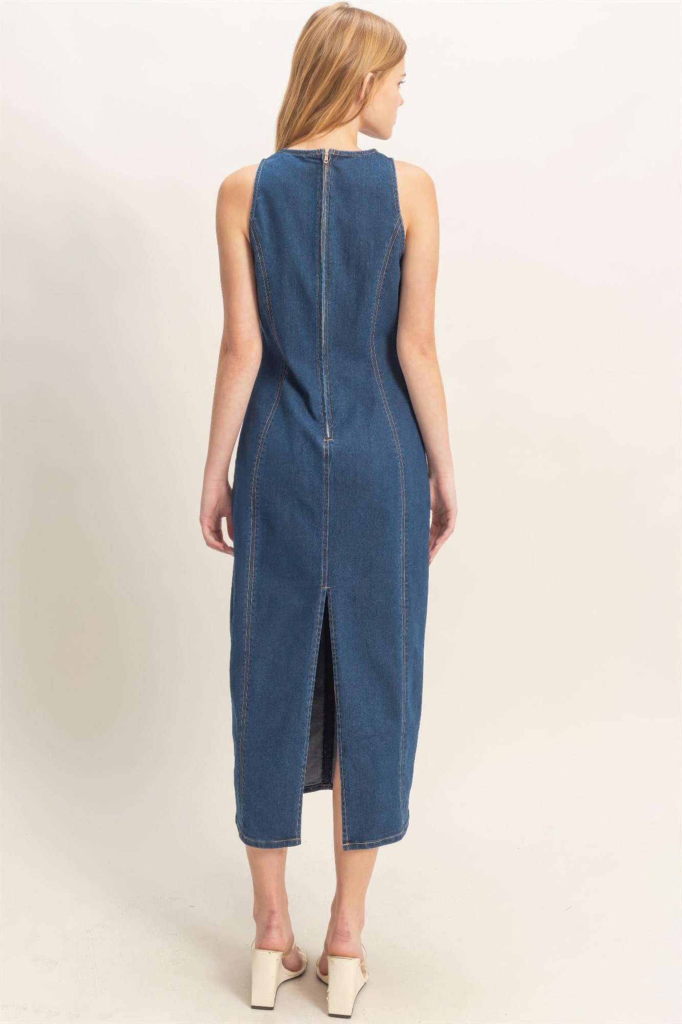 Elevate your everyday lineup with this sleeveless denim midi dress, designed with clean lines and modern versatility. Crafted from a comfortable stretch-blend fabric, it offers structure with a flexible, easy fit. The enzyme wash enhances its soft feel while adding subtle depth and character. A classic crew neckline keeps the silhouette refined, complemented by a straight cut that falls to a flattering midi length. The sleeveless design makes it ideal for layering or warm-weather styling. Pair it with ankle boots and a leather belt for a polished, contemporary ensemble.