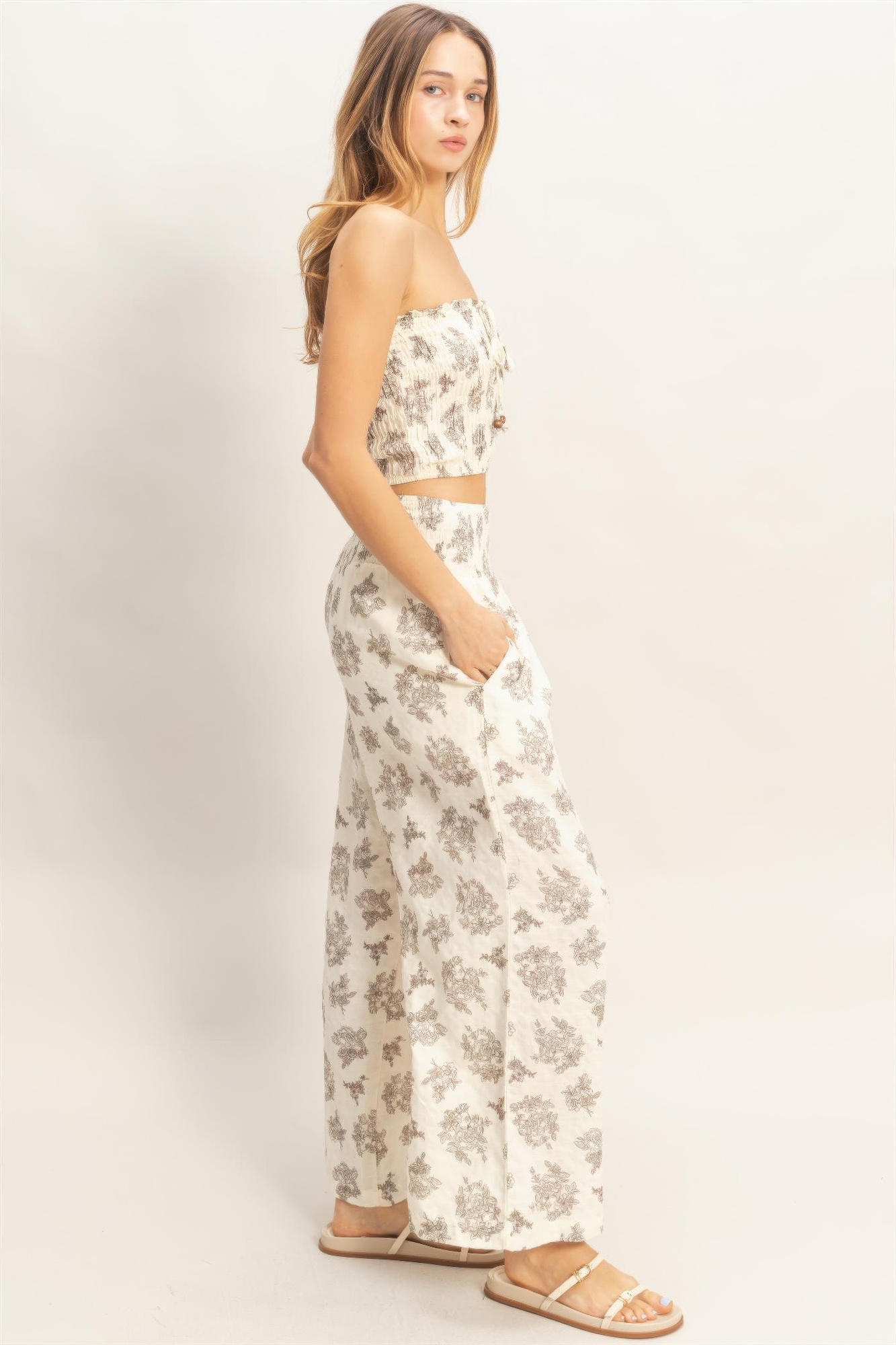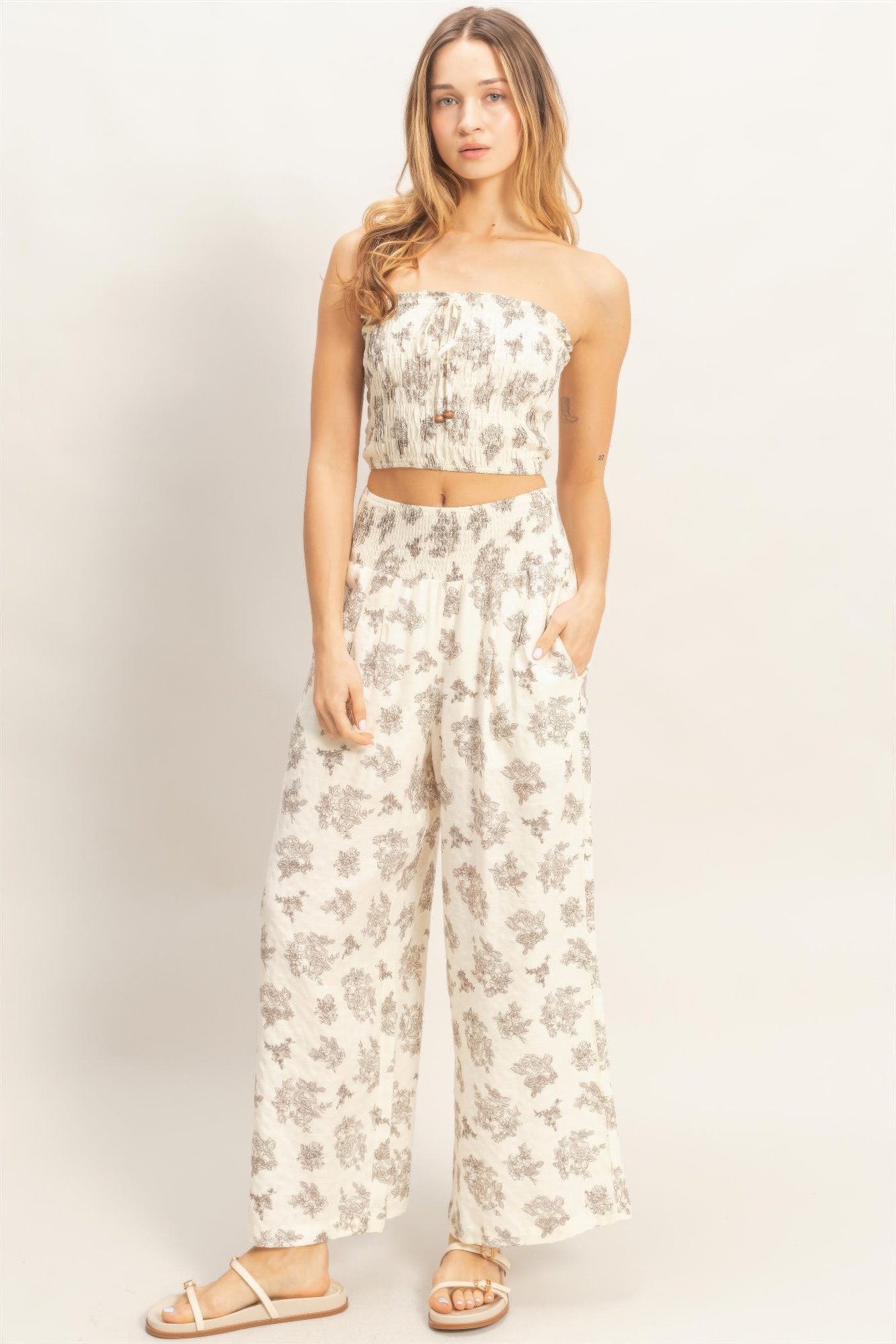 This smocked tube top and wide-leg pants set offers a stylish, coordinated look perfect for warm-weather outings. Crafted from lightweight woven fabric, the two-piece set balances comfort with effortless style. The smocked tube top features an elastic neckline and adjustable front tie for a secure, customizable fit. Paired with high-waisted wide-leg pants, the set creates a flattering silhouette with relaxed movement. Both pieces showcase delicate smocked detailing that adds texture and visual interest. Style this set with wedge sandals or simple accessories for an easy, polished summer ensemble.