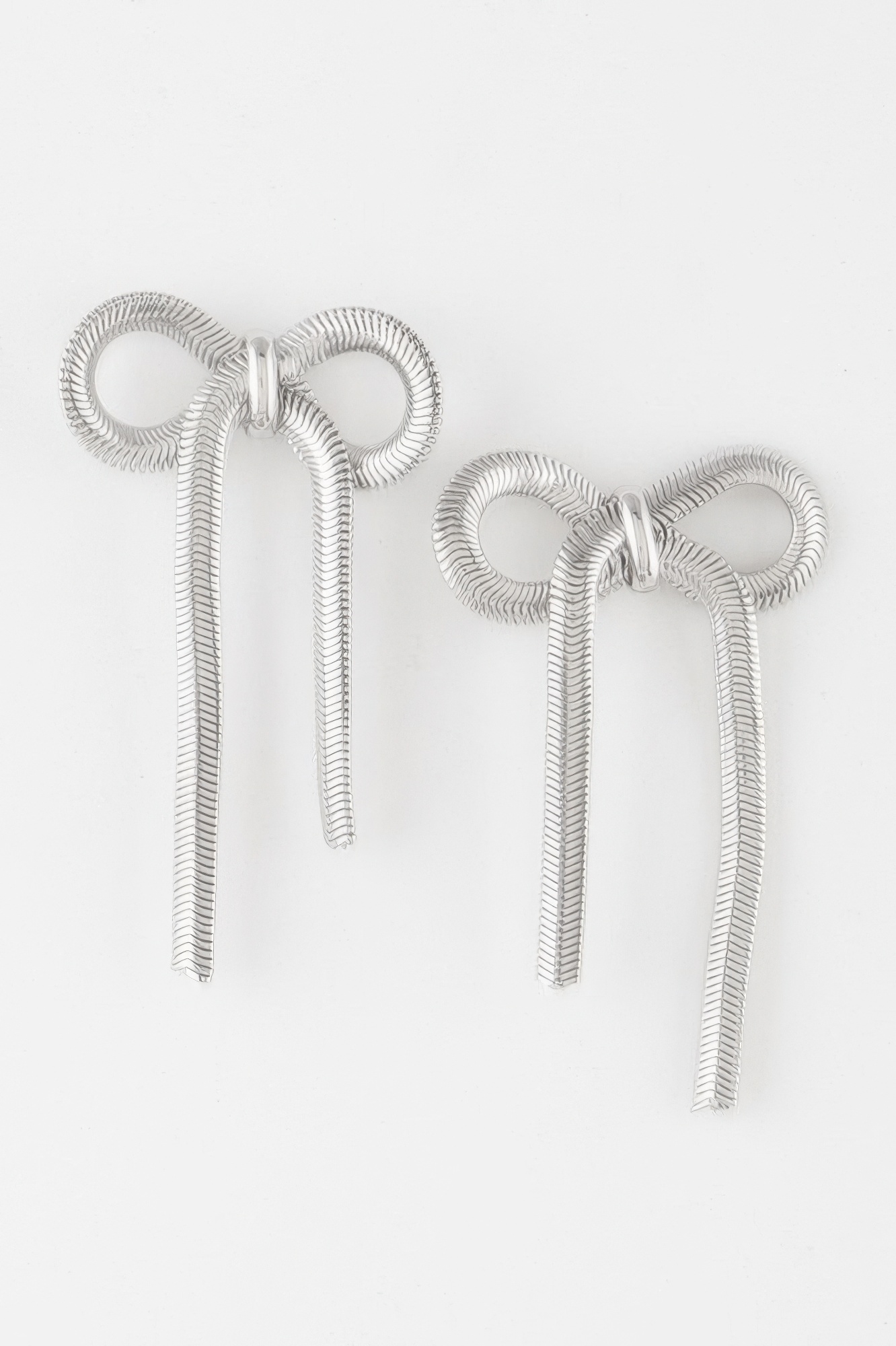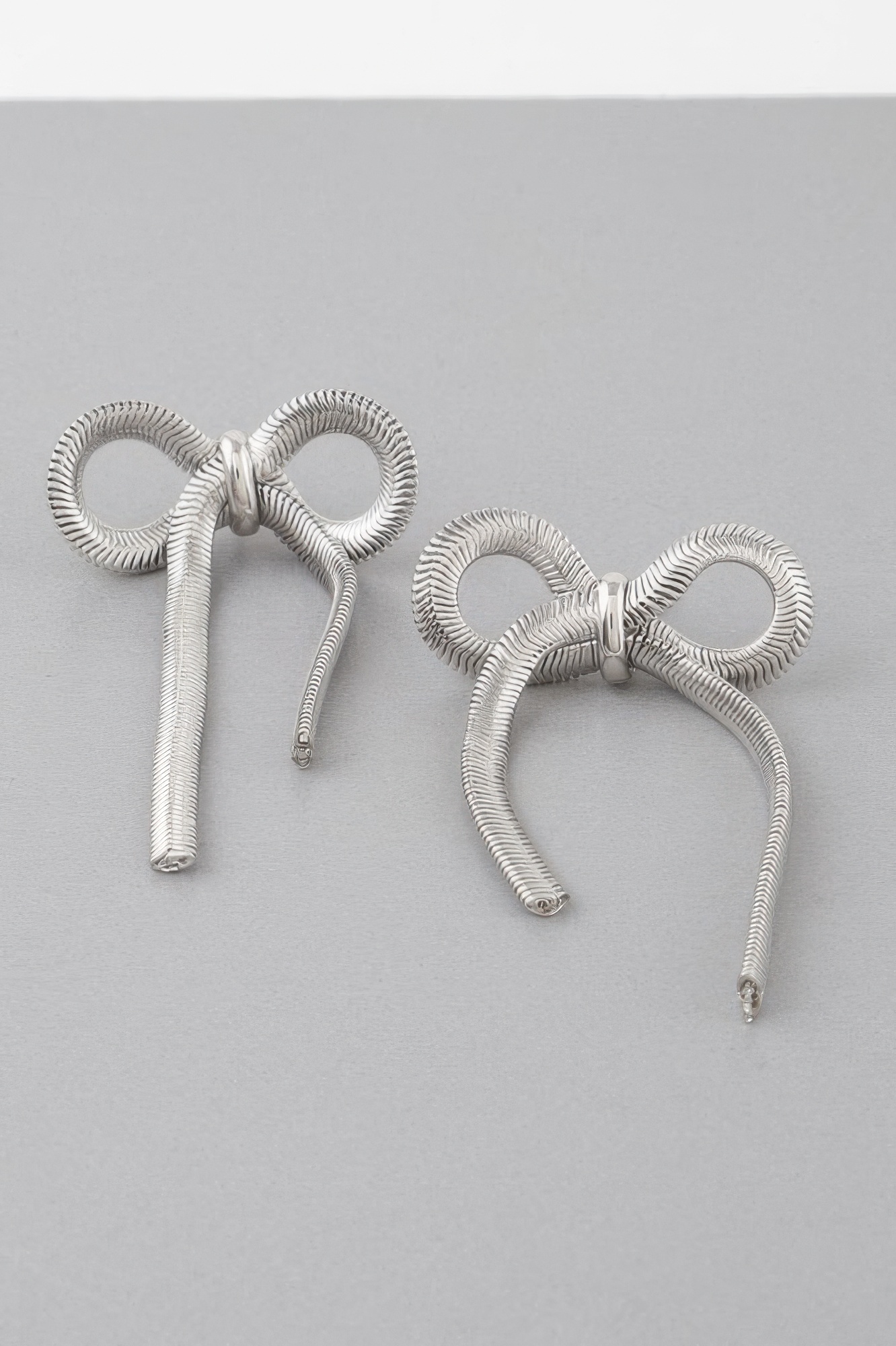 The Snake Chain Ribbon Earrings combine a sleek chain texture with delicate ribbon shapes for a refined yet modern aesthetic. Their curved silhouette adds graceful movement, while the metallic finish keeps the look polished. Wear them to elevate a casual outfit or pair them with dressy attire for a minimalist, elegant statement.