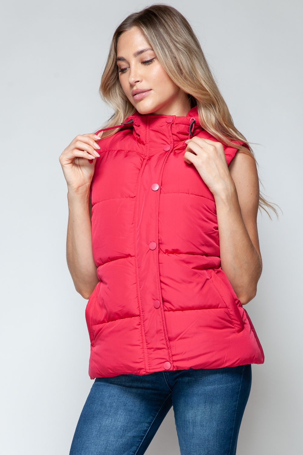The hooded vest features both snap and zip closures, offering convenience and style. The combination of snap buttons and zippers allows for easy adjustments and secure closure. The hood adds an extra element of warmth and protection, making it a practical and stylish choice for various weather conditions.