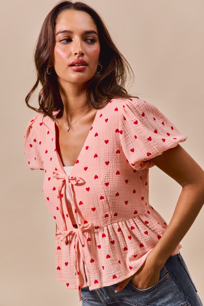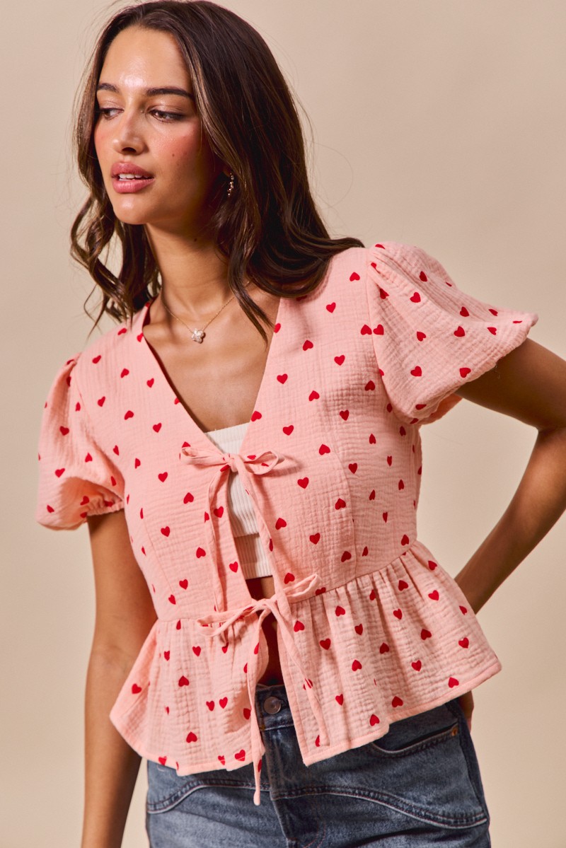 This all-over heart ribbon tie baby doll Valentine top is a sweet and romantic addition to your wardrobe, perfect for celebrating the season of love. The heart print and ribbon tie detailing add a charming and feminine touch to the baby doll style. With its flattering silhouette and cute design, this top is ideal for creating a playful and whimsical look. Embrace the Valentine's Day spirit with this adorable and unique top that exudes romance and charm. Spread love and style with this darling baby doll top that captures the essence of Valentine's Day beautifully.