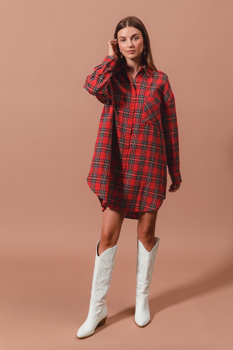 This Red Plaid Oversized Shirt Dress is a stylish and comfortable choice for any occasion. Made from a soft and breathable fabric, this dress features a classic plaid pattern, button-down front, and chest pocket detail. The oversized fit and shirttail hem add a touch of casual flair, while the long sleeves make it perfect for layering. Dress it up with heels or keep it casual with sneakers for a versatile look.