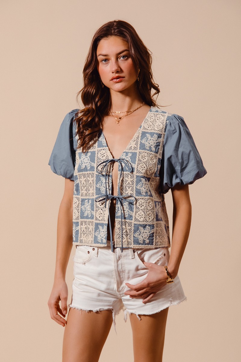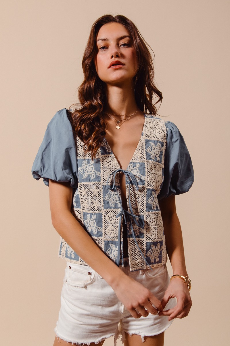 This stunning bohemian-inspired blouse features a distinctive vintage patchwork print in soft blue and cream tones. Crafted from lightweight, breathable fabric with a comfortable cotton blend, it showcases romantic puff sleeves and an elegant V-neckline with adjustable tie closure. The cropped design offers versatility for high-waisted bottoms, while the relaxed fit ensures all-day comfort. Perfect for casual outings, weekend brunches, or layering pieces, this blouse combines vintage charm with contemporary style trends.