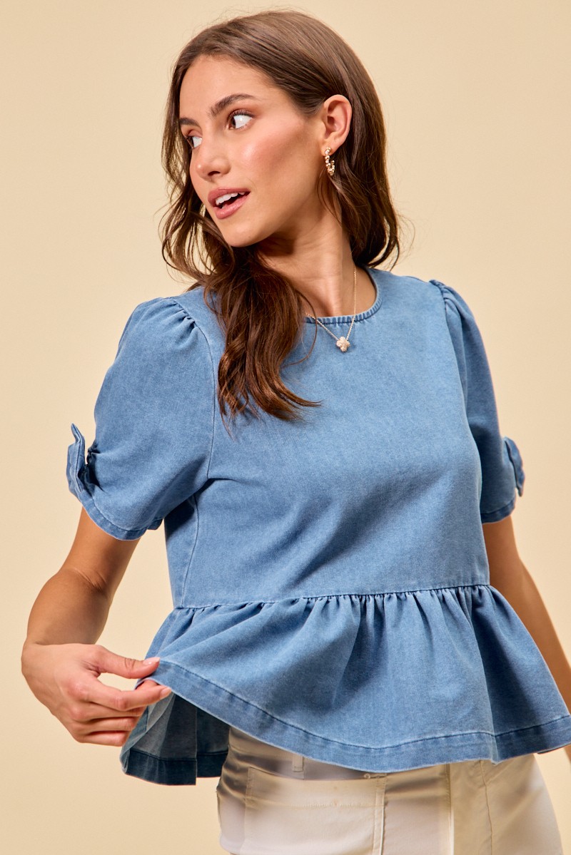 The Denim Bow Detail Short Sleeves Peplum Top is a charming and playful addition to any wardrobe, combining the casual look of denim with a feminine peplum silhouette. The bow detail at the neckline adds a sweet and stylish touch, creating a unique and eye-catching design. With short sleeves, this top is perfect for warmer weather and can be easily dressed up or down for various occasions. The peplum hem accentuates the waist and creates a flattering shape, while the denim fabric gives it a laid-back yet chic vibe. Whether paired with jeans for a casual day out or with a skirt for a more dressed-up look, this top is versatile and on-trend.