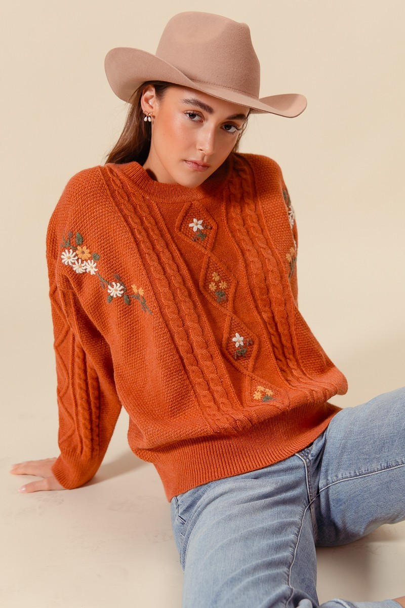 Elevate your winter wardrobe with this charming embroidered flower cable knitted sweater. The intricate floral embroidery adds a delicate and feminine touch to the classic cable knit design. This cozy sweater features a crew neck and long sleeves, perfect for keeping you warm and stylish during the colder months. The textured cable knit pattern adds depth and interest to the sweater, making it a standout piece in your closet. Pair this sweater with jeans or a skirt for a versatile and on-trend look that is sure to make a statement.