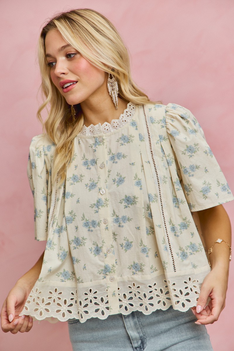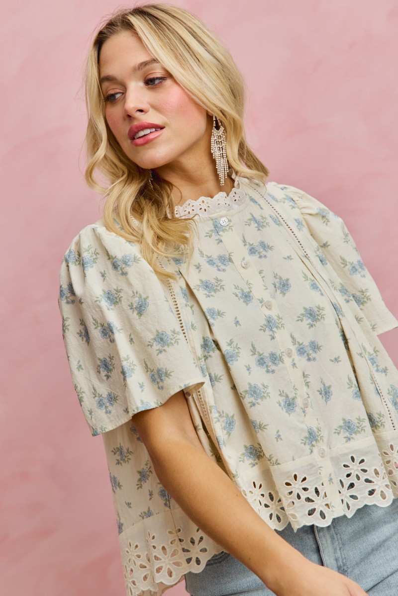 This blouse showcases a beautiful floral print with delicate lace trim detailing for a feminine and elegant touch. The flutter sleeves add a whimsical and romantic flair to the overall look. Perfect for adding a touch of charm to any outfit. Made of lightweight and comfortable fabric, it's ideal for all-day wear. Embrace your feminine side with this lovely floral print blouse featuring lace trim and flutter sleeves!