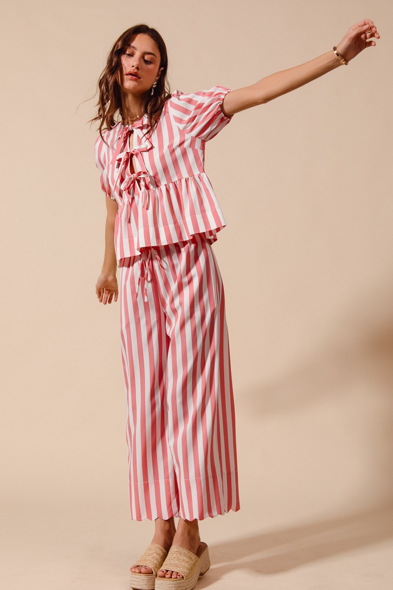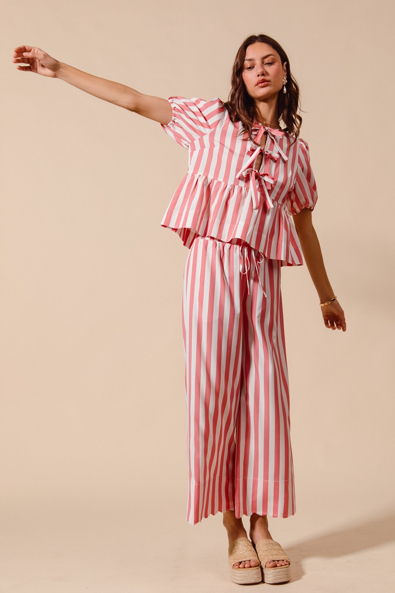 This stylish matching set features a coordinated pink and white striped pattern that creates a cohesive and put-together look. The set includes a tie-front blouse with feminine bow details and matching wide-leg pants with an elastic waistband for ultimate comfort. Made from lightweight, breathable fabric perfect for warm weather styling. The classic vertical stripes create a flattering silhouette while the relaxed fit ensures all-day comfort. This versatile set can be dressed up with heels for a polished look or worn casually with sandals for everyday wear. The coordinated design eliminates the guesswork of outfit coordination, making it a perfect wardrobe essential for the modern woman who values both style and convenience.