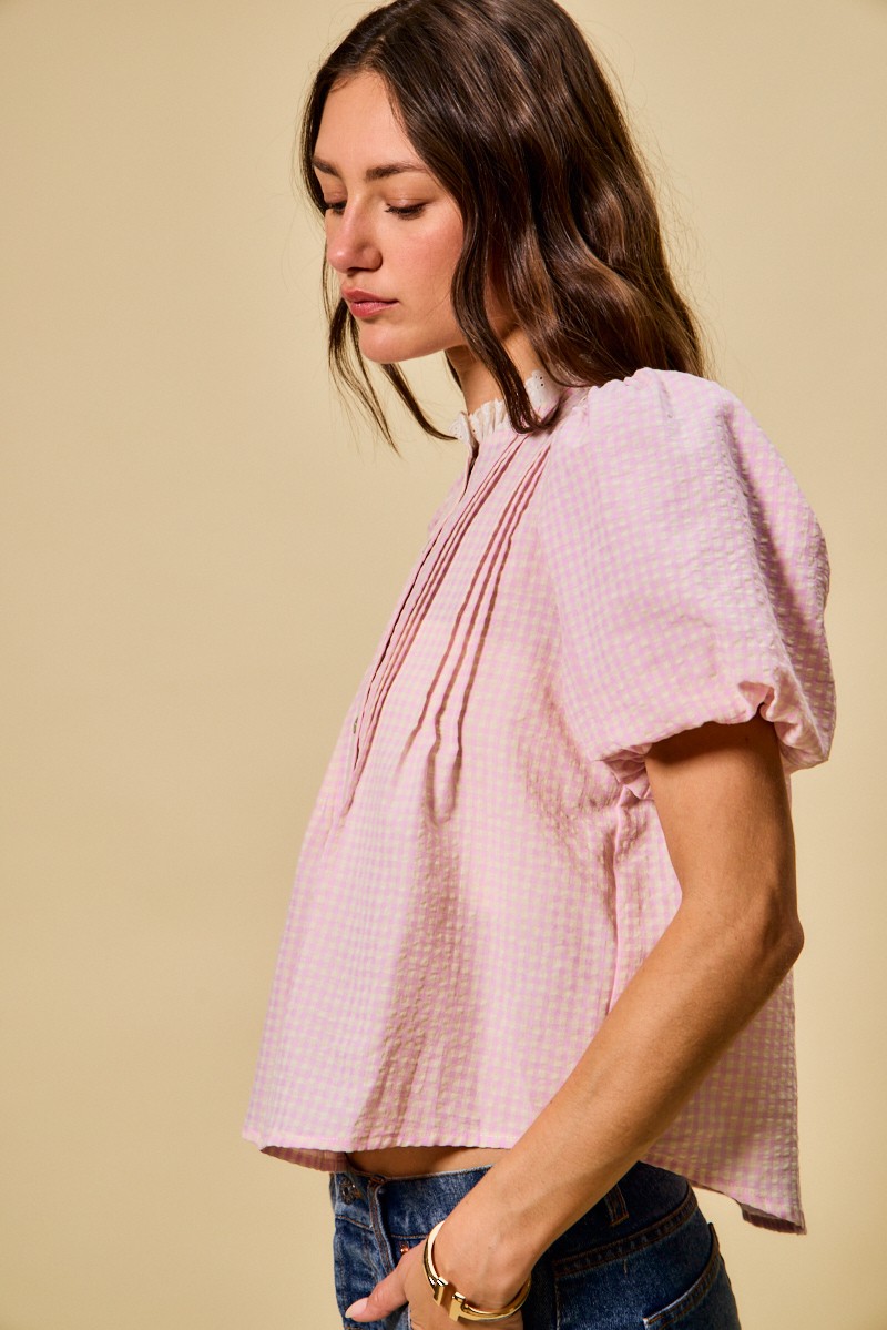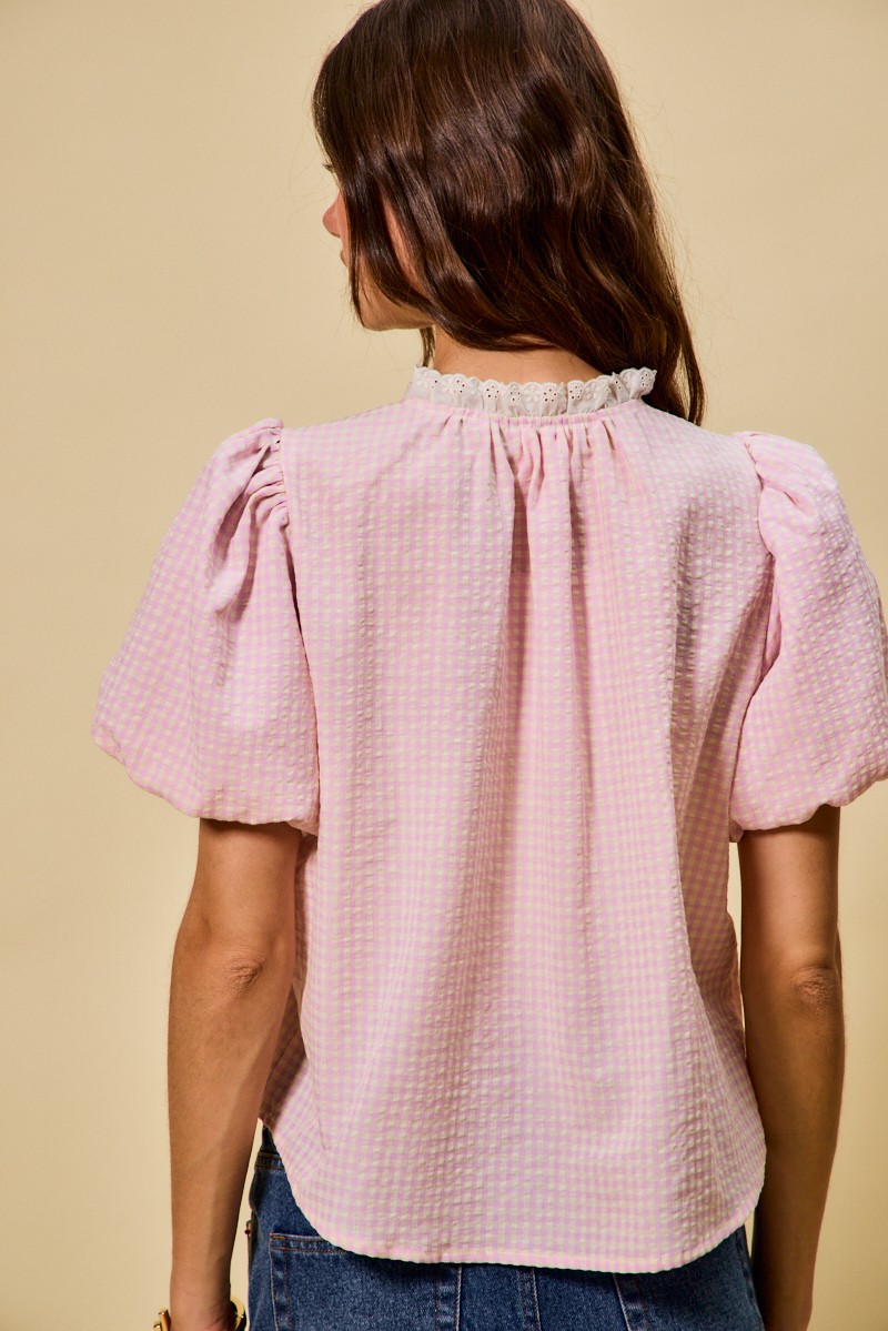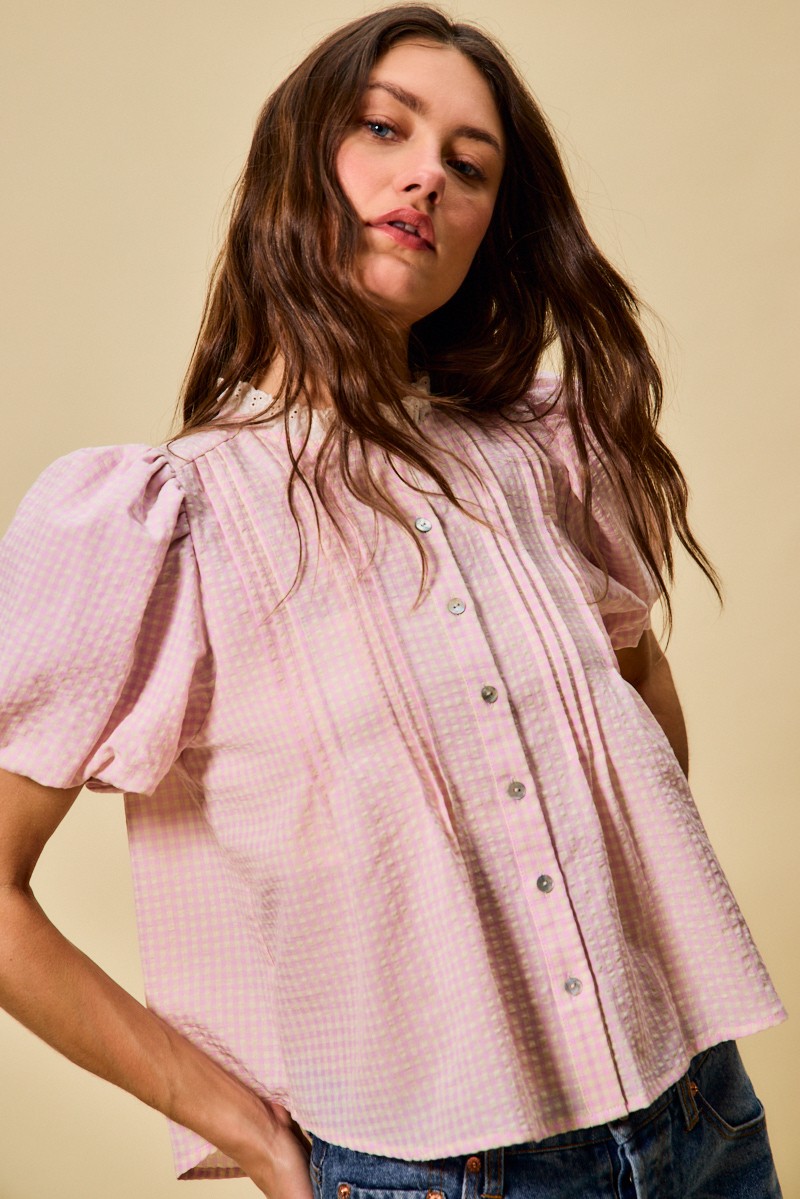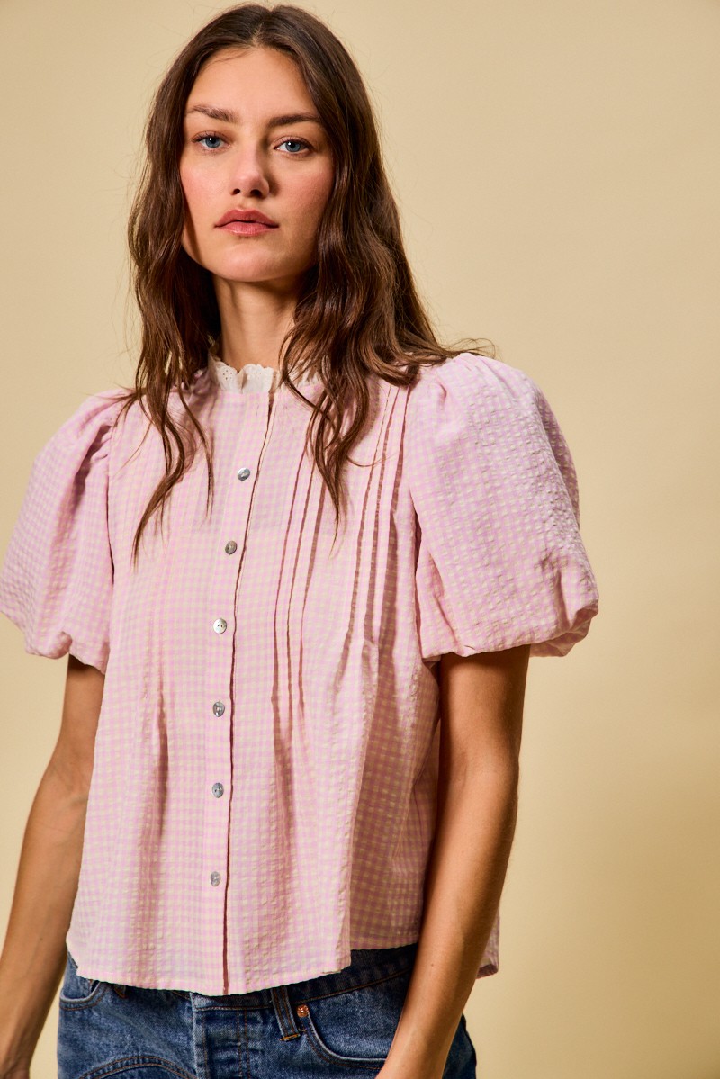 This blouse showcases a pretty gingham pattern with delicate lace trim details. The button-up design and bubble sleeves add a touch of femininity. Perfect for a sweet and romantic style. The lightweight fabric makes it comfortable to wear all day long. Pair it with a skirt or pants for a chic ensemble.